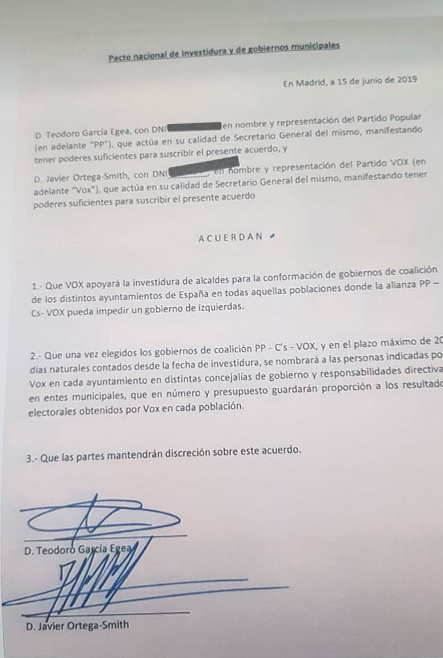 El último punto recoge también que "las partes mantendrán discreción sobre el acuerdo". En opinión de Vox, el primero que ha incumplido ese pacto es el PP después de que el alcalde de Madrid, José Luis Martínez Almeida, anunciara la composición de su gobierno un día después de firmarlo, dejando fuera a Vox. También ha señalado a Cs al asegurar que "ambos han incumplido y han intentado manipular a la opinión pública" sobre su contenido.