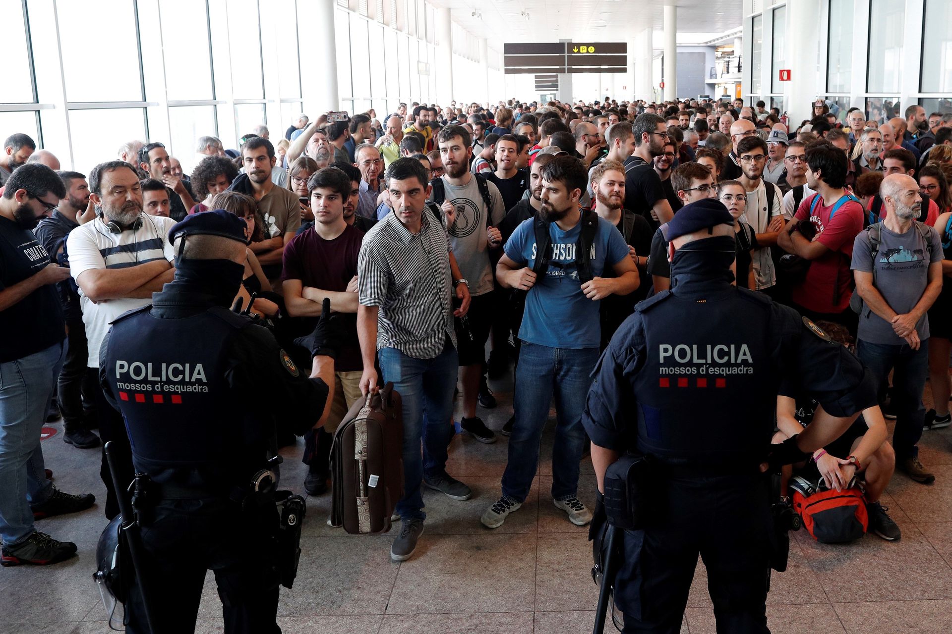 Agentes de los Mossos d'Esquadra y de la Policía Nacional controlan el acceso de personas a la terminal 1 del Aeropuerto de El Prat tras el anuncio de la plataforma Tsunami Democràtic que ha llamado a paralizar la actividad del aeropuerto, en protesta por la condena a los líderes del 'procés', así como para reclamar al Gobierno de Pedro Sánchez que se avenga a negociar un referéndum de autodeterminación en Cataluña.