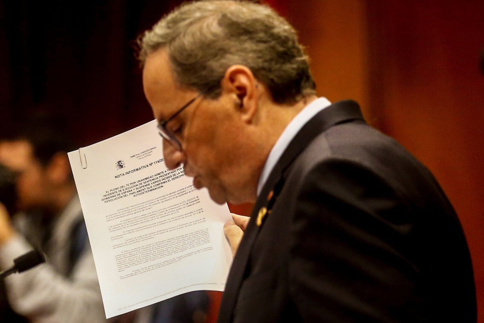 Quim Torra ha aprovechado su comparecencia, a petición propia, en el Parlamento de Cataluña para prometer un referéndum de autodeteminación con el que concluir la legislatura autonómica. Ese ha sido el anuncio más destacado de una intervención en la que el presidente de la Generalidad se ha dedicado a arremeter contra el Tribunal Constitucional, el Gobierno de Sánchez, la oposición constitucionalista y ha descartado la convocatoria de elecciones autonómicas. También ha dedicado una pequeña parte de su discurso para reiterar que el independentismo es ajeno a la violencia.