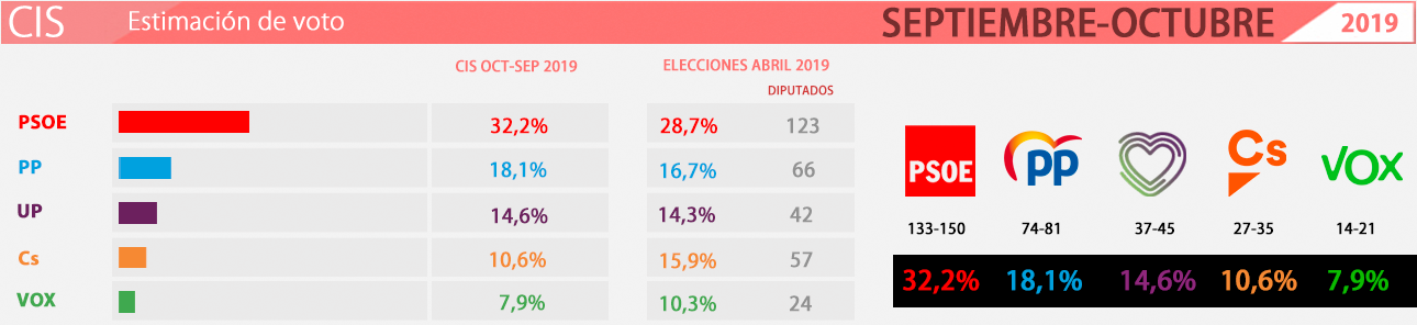 Pese a que el amplísimo trabajo de campo del barómetro del CIS terminó justo antes de la publicación de la sentencia del Tribunal Supremo en el juicio a los golpistas y el inicio de los disturbios violentos en Cataluña –y, por lo tanto, también con anterioridad a la exhumación de Franco–, el PSOE sigue siendo la fuerza más votada pero cae de un 34,2% de intención de voto un mes antes a un 32,2%.
