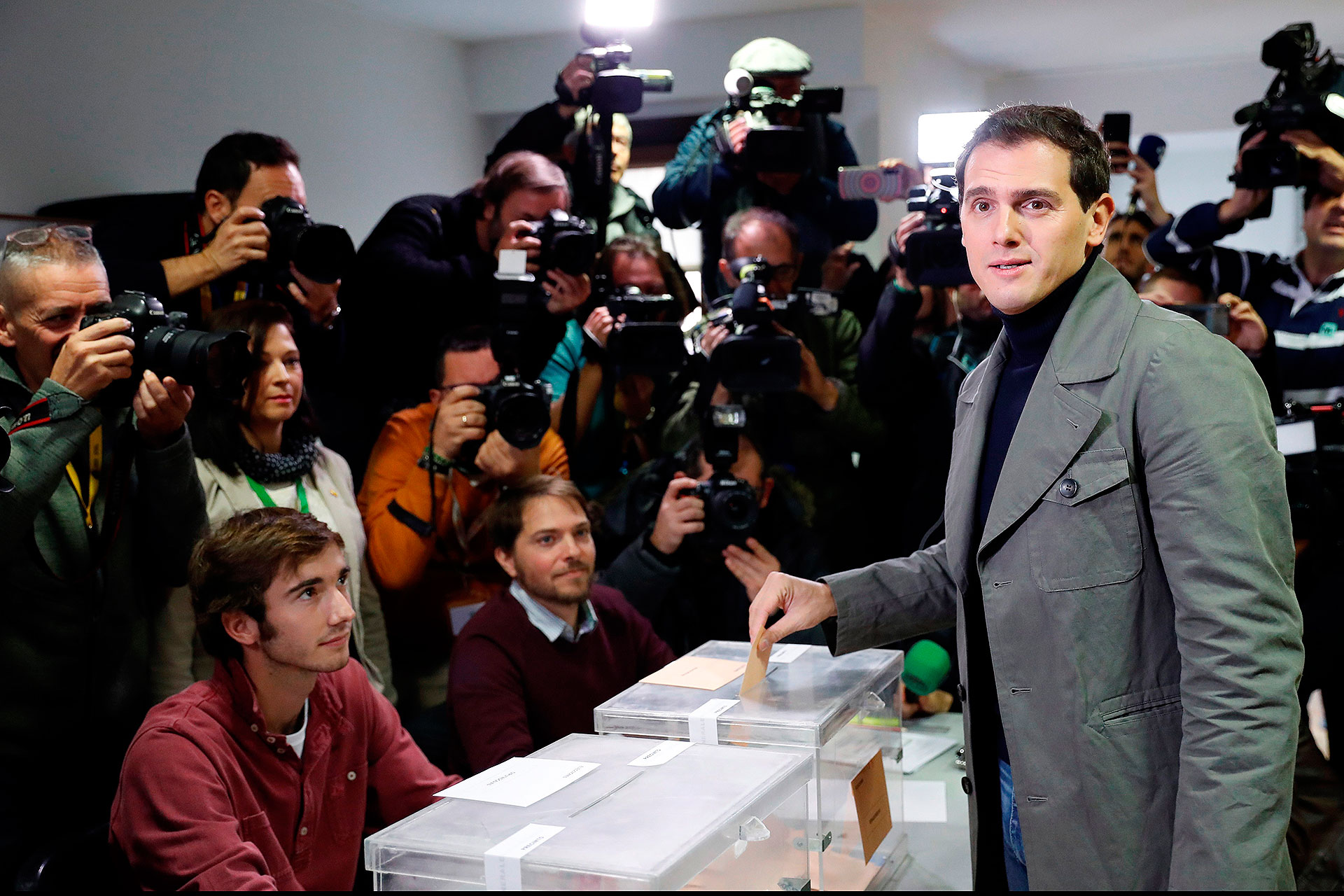 Albert Rivera ha votado a las 10:44 horas en el Espacio Cultural Volturno de Pozuelo de Alarcón, en Madrid, en el mismo centro donde una hora antes había acudido el candidato socialista, Pedro Sánchez.
