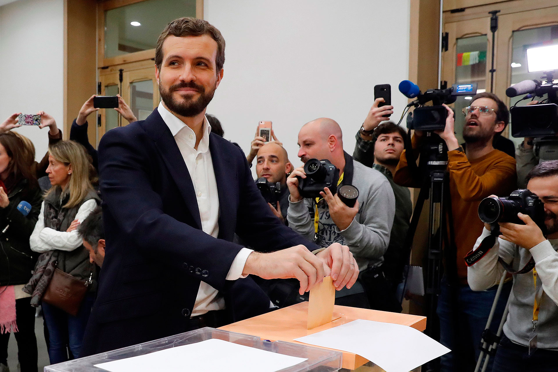El presidente del PP y candidato a la presidencia del Gobierno, Pablo Casado, ha sido el tercer candidato en votar, lo ha hecho a las 10:20 horas en el Colegio Nuestra Señora del Pilar de Madrid.