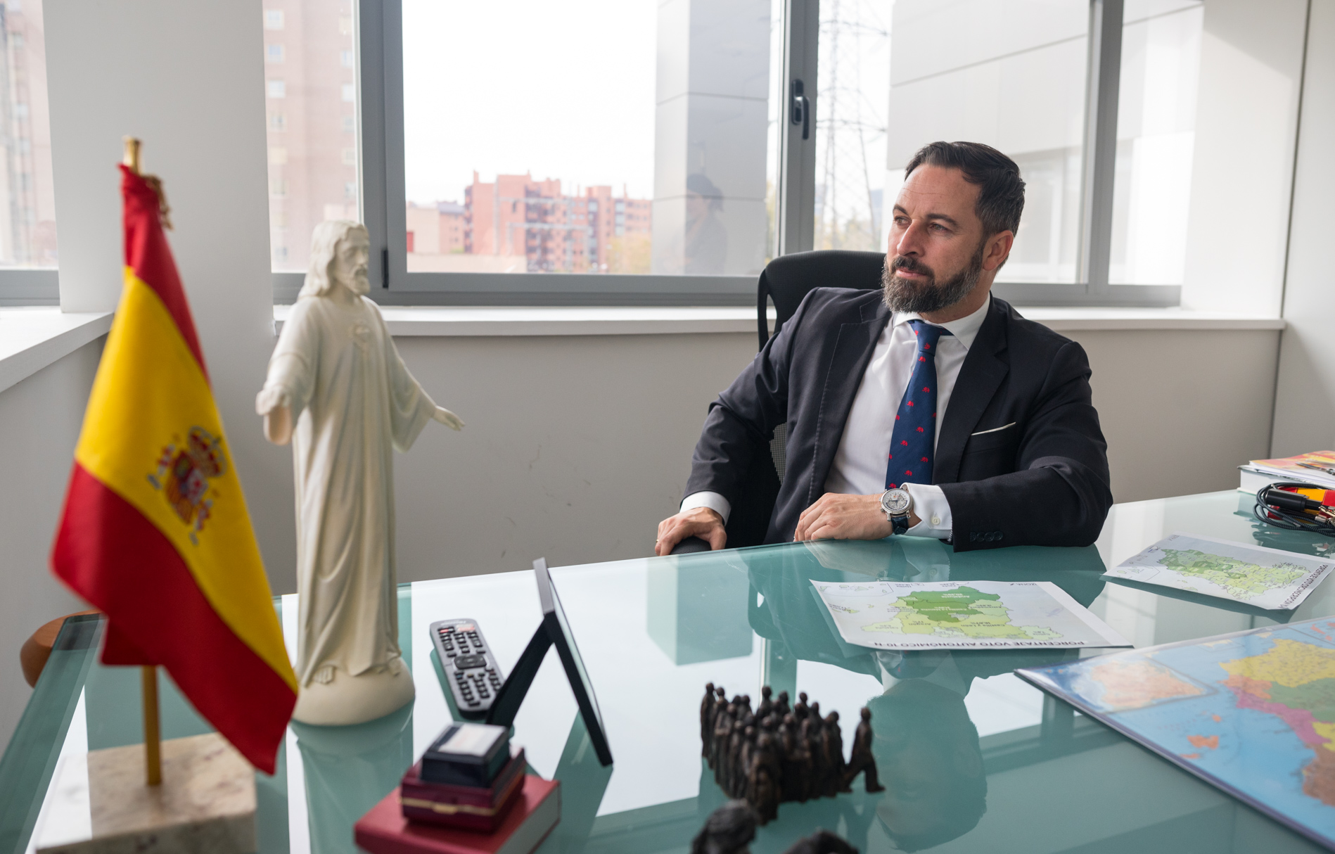 Santiago Abascal nos recibe en su nuevo despacho situado en un edificio de cuatro plantas del barrio de Chamartín justo después de recoger su acta de diputado. Es la segunda vez en un año que el partido cambia de sede debido al crecimiento experimentado en los últimos meses y que les ha permitido ser ya la tercera fuerza política del país. En su primera entrevista después del 10-N, el presidente de Vox hace balance de lo ocurrido tras las elecciones, avanza algunos de sus proyectos para la próxima Legislatura y advierte de la grave situación a la que se enfrenta España ahora que se asoma al abismo de tener un partido comunista en el Gobierno.