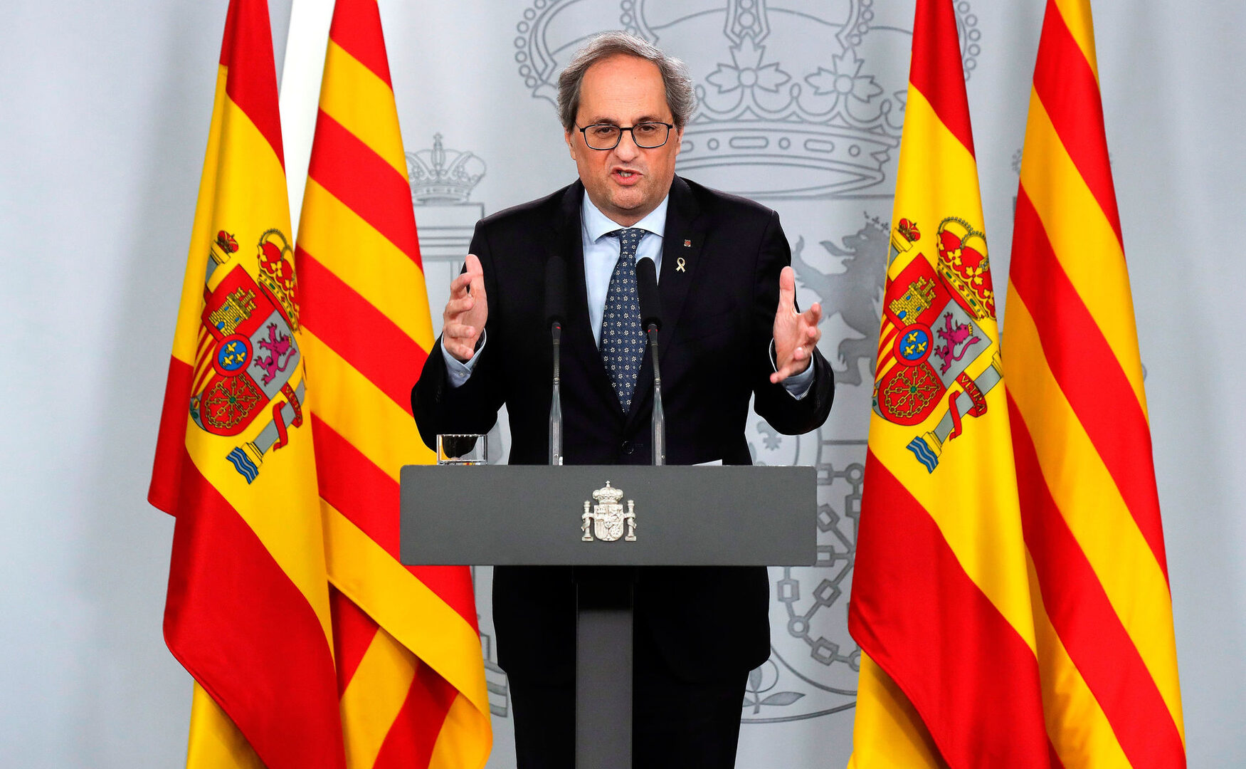 La rueda de prensa de Torra no ha durado ni cinco minutos. El dirigente separatista ha justificado la celeridad en que la delegación catalana debía tomar un avión hacia Barcelona.