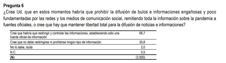 En otros casos resultan más que llamativas la combinación entre las preguntas tremendamente tendenciosas y las opciones que se dan para responder, no menos sesgadas. Por ejemplo, en la inevitable pregunta sobre si "habría que prohibir la difusión de bulos y las informaciones engañosas y poco fundamentadas por las redes y los medios de comunicación social, remitiendo toda la información sobre la pandemia a fuentes oficiales".
