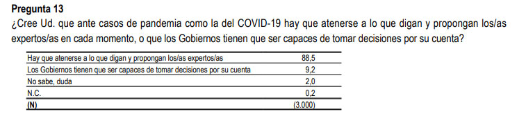 Otra pregunta llamativa es una cuya intención evidente es apuntar una de las líneas de defensa evidentes del Gobierno, que es culpar a los técnicos de los propios errores. Así el sondeo cuestiona si "ante casos de pandemia como la del Covid-19 hay que atenerse a lo que digan y propongan los/as expertos/as en cada momento, o que los Gobiernos tienen que ser capaces de tomar decisiones por su cuenta".