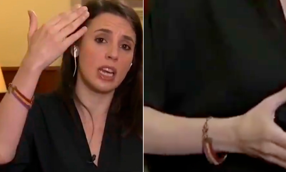 La ministra de Igualdad ha sido entrevistada en TVE luciendo una pulsera con la bandera republicana —de fondo.y muy juntas aparecían la bandera española y una de la UE— y ha aprovechado para defender a su pareja y atacar a Cayetana Álvarez de Toledo.