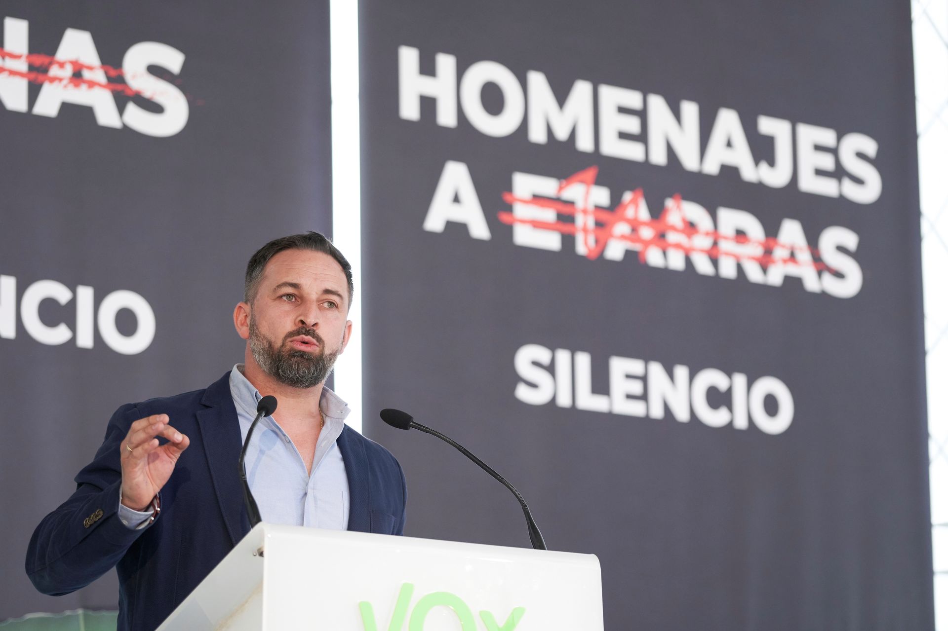 El líder de Vox ha acompañado a sus cabezas de cartel, Amaia Martínez por Álava, Niko Gutiérrez por Vizcaya y María Pérez por Guipúzcoa, en un llamativo escenario compuesto por cuatro paneles en los que se podían leer frases como Imposición del euskera, Caso Zaldíbar, Menas y Homenaje a etarras, con la última palabra de cada una tachada y acompañadas por el término "silencio", en referencia al lema escogido por el partido para la campaña.