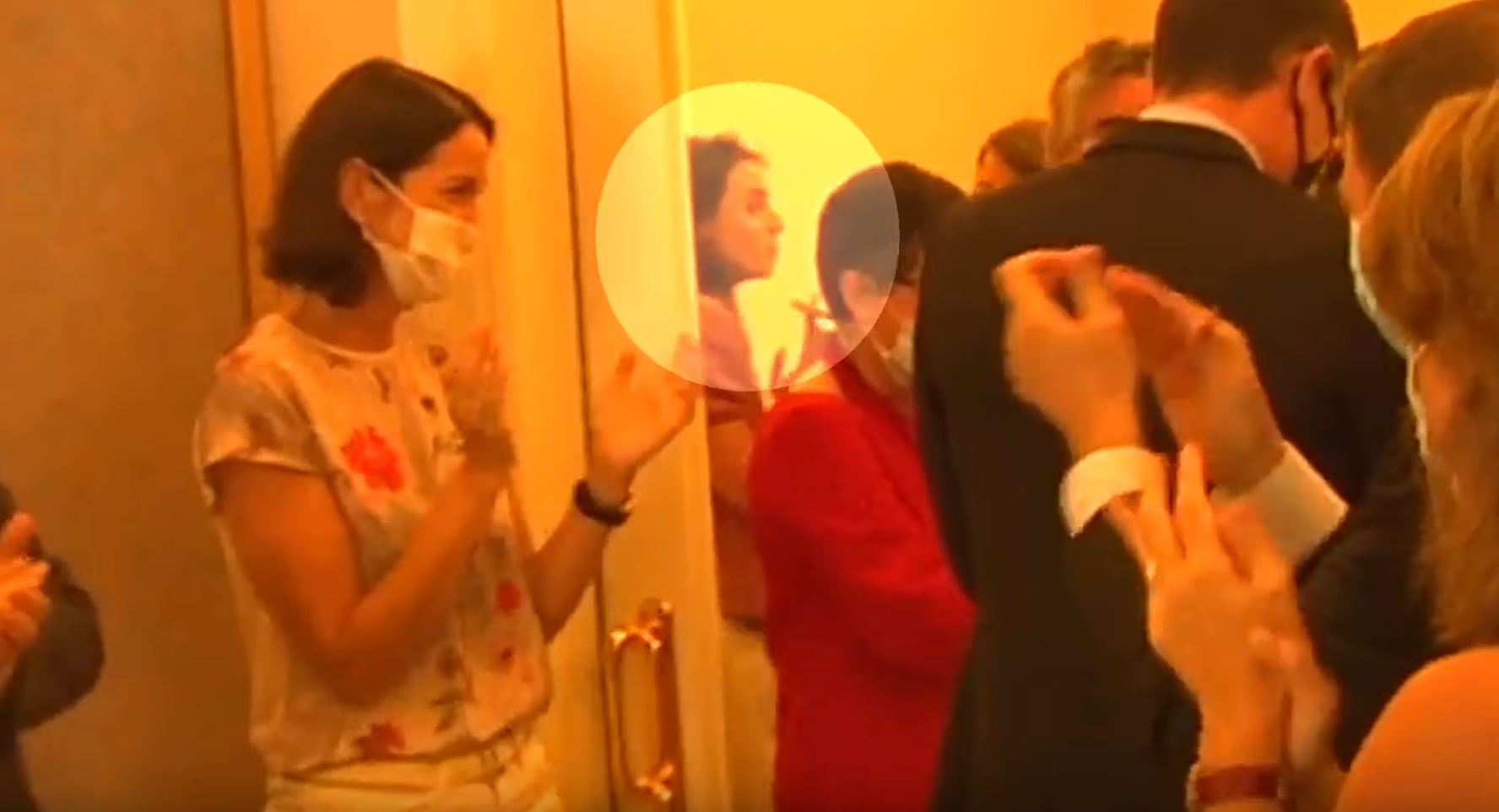 Irene Montero, única sin mascarilla en la teatral ovación a Sánchez en Moncloa