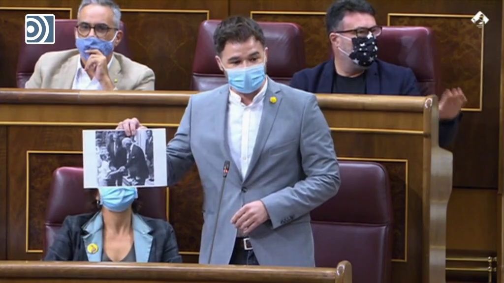 Rufián ha enseñado una imagen de la infancia de Felipe VI en la que se le podía ver saludando a Franco y ha asegurado que "a Felipe VI le votó un español: Francisco Franco".