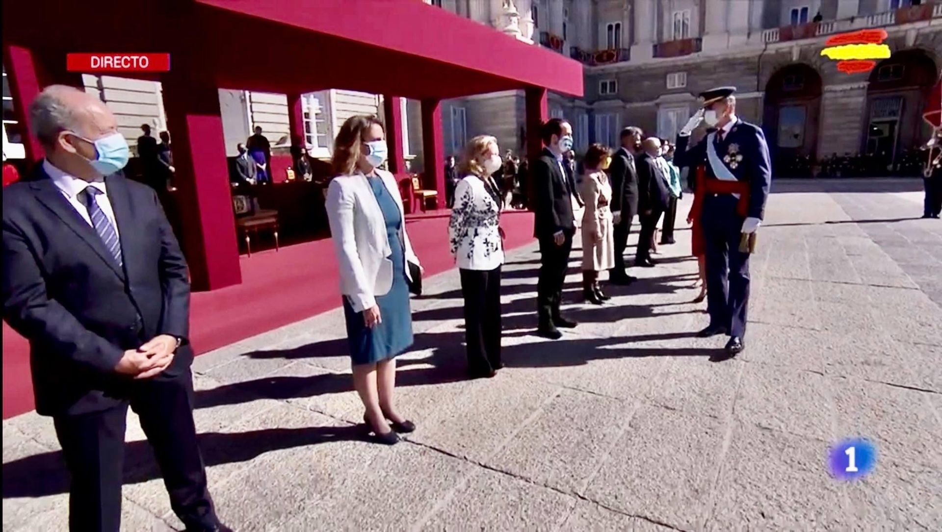 Tras el saludo militar del monarca, Iglesias le ha respondido con un levísimo asentimiento de la cabeza, mientras otros miembros del Ejecutivo han optado por llevarse la mano al corazón.