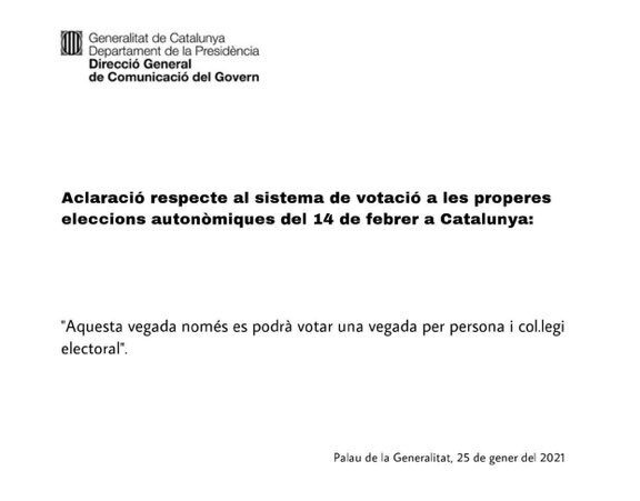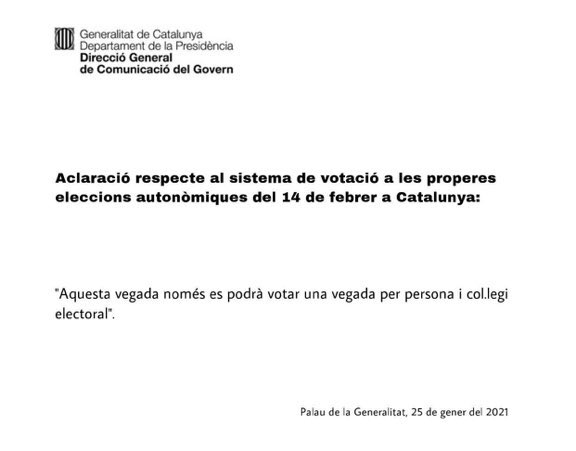 "Aclaración respecto al sistema de votación en las próximas elecciones autonómicas del 14 de febrero en Cataluña: Esta vez sólo se podrá votar una vez por persona y colegio electoral" es el contenido de la supuesta carta de la Generalidad que está haciendo furor en las redes sociales. El descrédito de la administración autonómica sumado a los referéndums golpistas del 9 de noviembre de 2014 y 1 de octubre de 2017 (en los que decenas de separatistas se retrataron votando varias veces en diferentes colegios) ha hecho que un una "agencia de verificación" de noticias y la propia agencia Efe consultaran en la Generalidad si esa nota era suya.