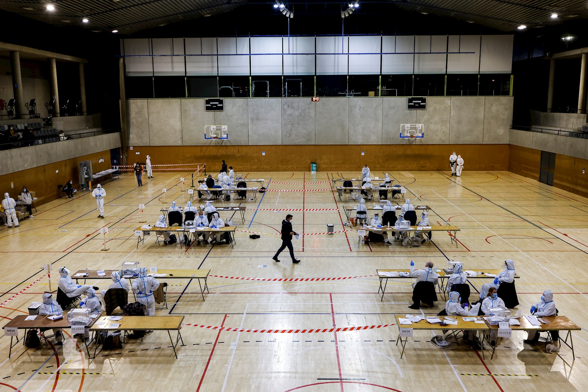 Varias personas vestidas con equipos de protección individual (EPI), trabajan en las mesas electorales del Polideportivo Municipal de la España Industrial de Barcelona.
