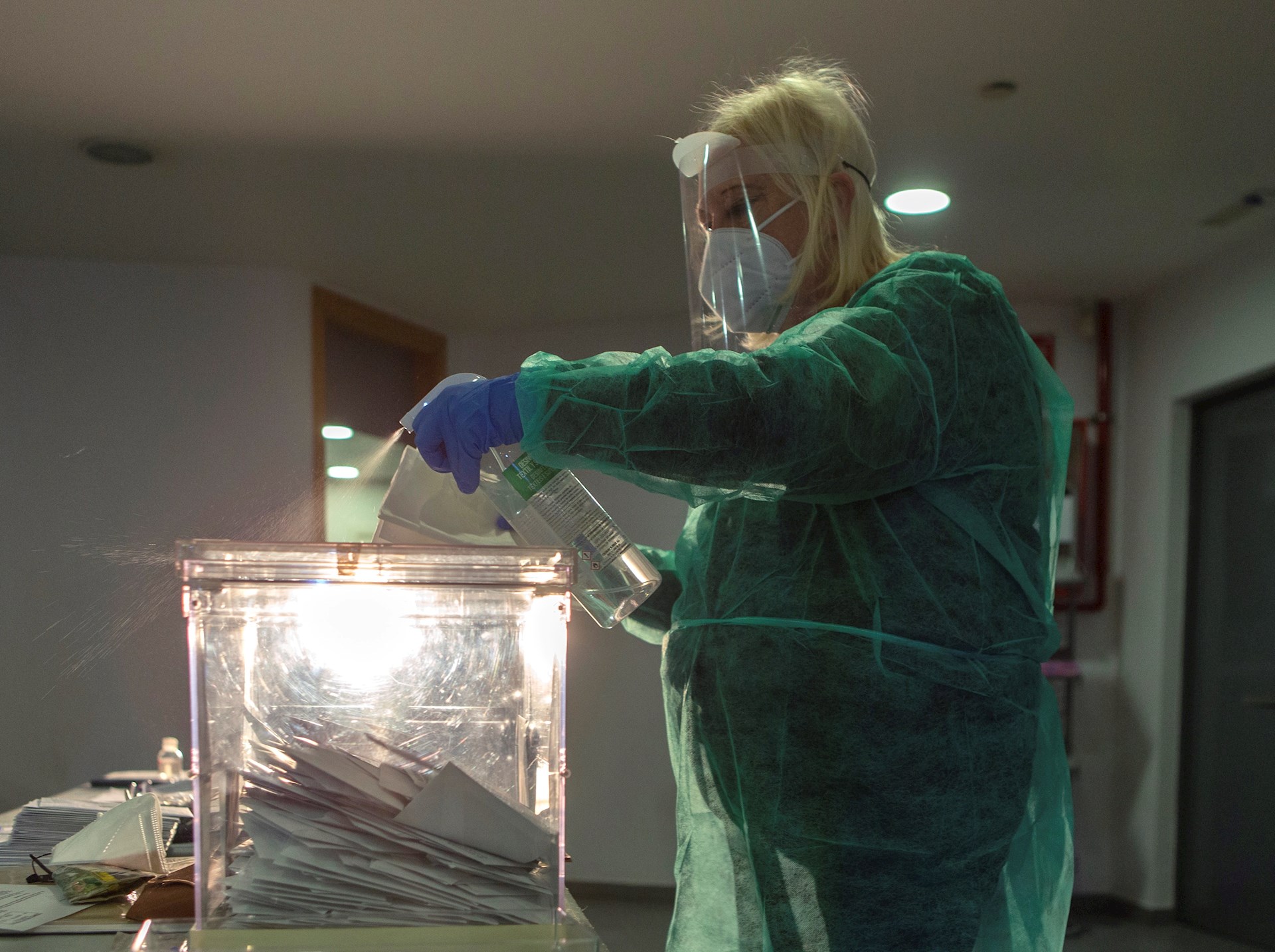 Integrantes de una mesa electoral de la localidad barcelonesa de El Masnou, desinfecta una de las urnas instaladas durante el horario de votación para elegir el gobierno autonómico de Cataluña.