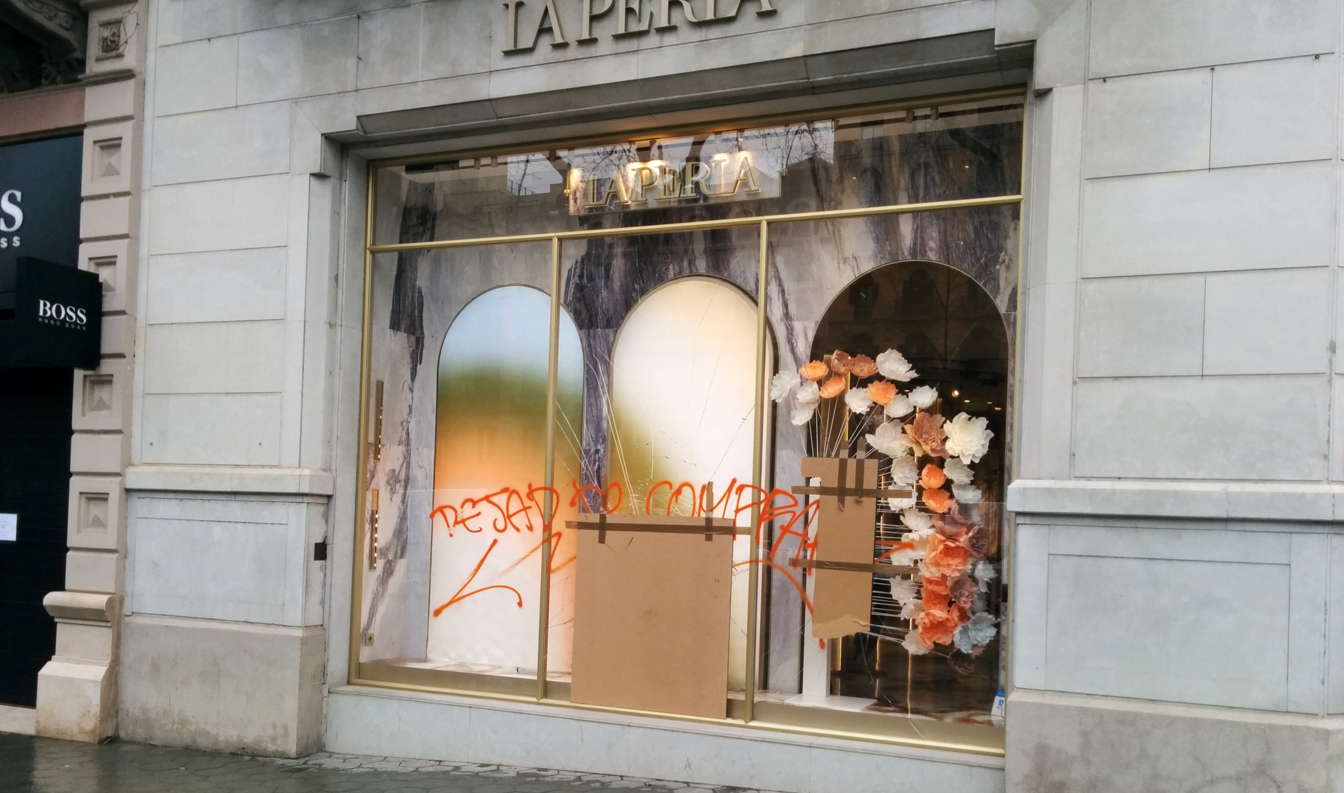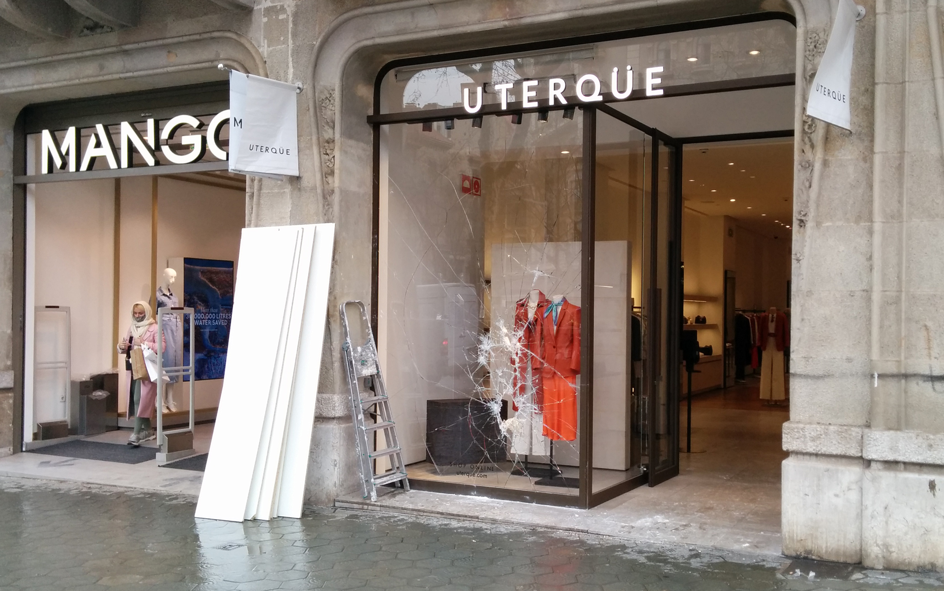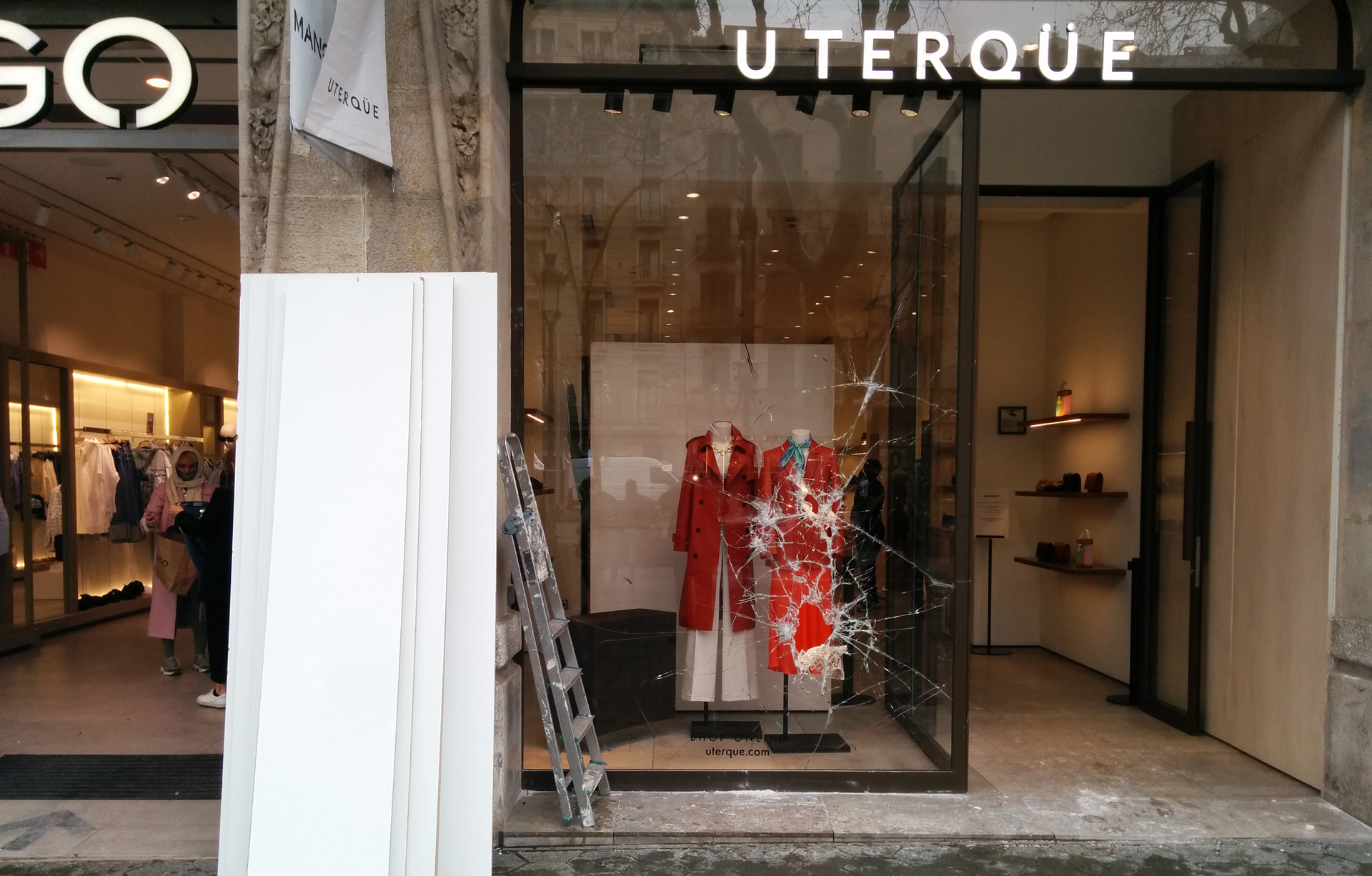 El escaparate de la tienda Uterque en el Paseo de Gracia de Barcelona, visiblemente dañado por los radicales.