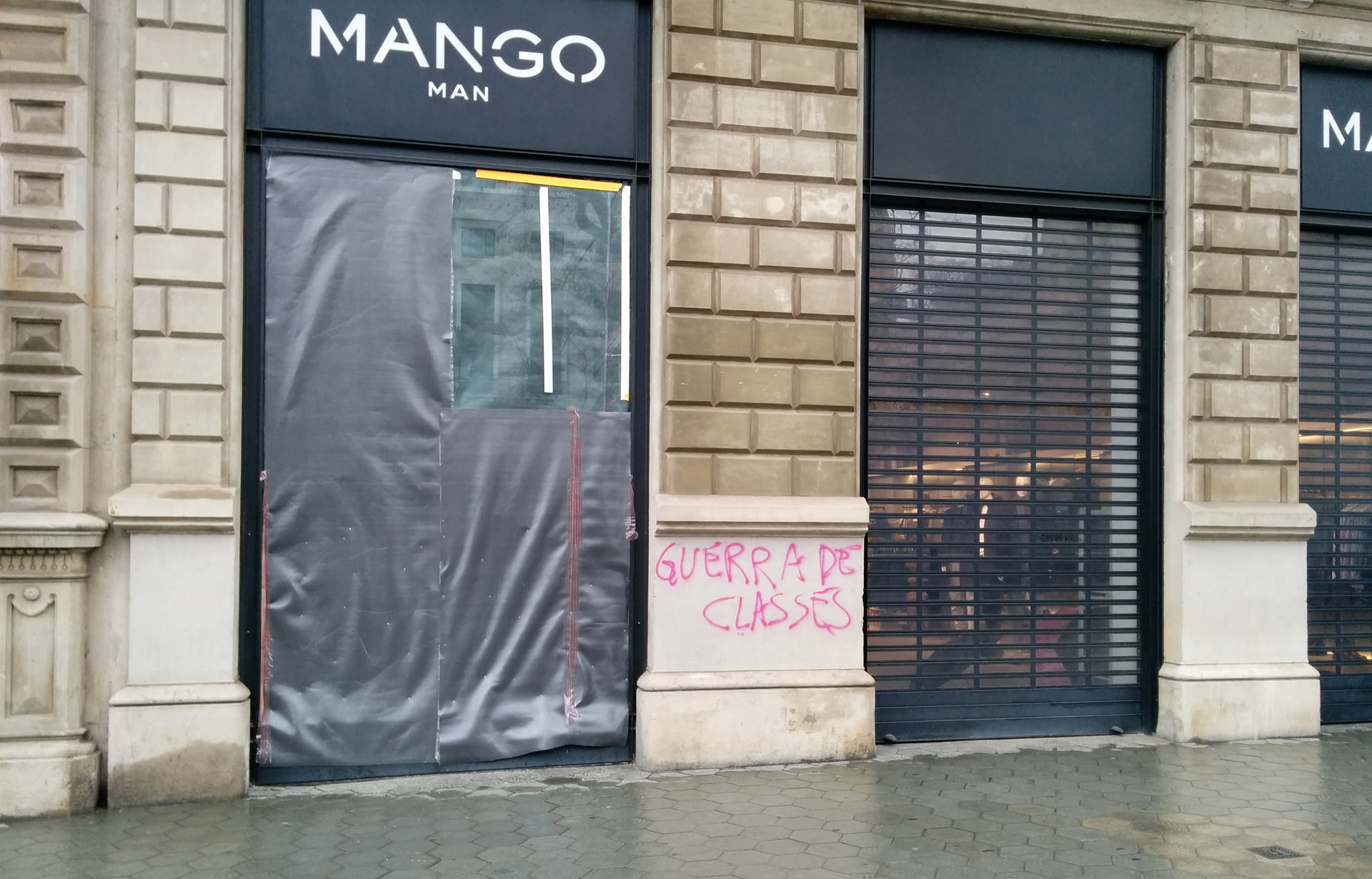 La fachada de la marca Mango, completamente cubierta por una lona y con una pintura en la que se puede leer "guerra de clases".