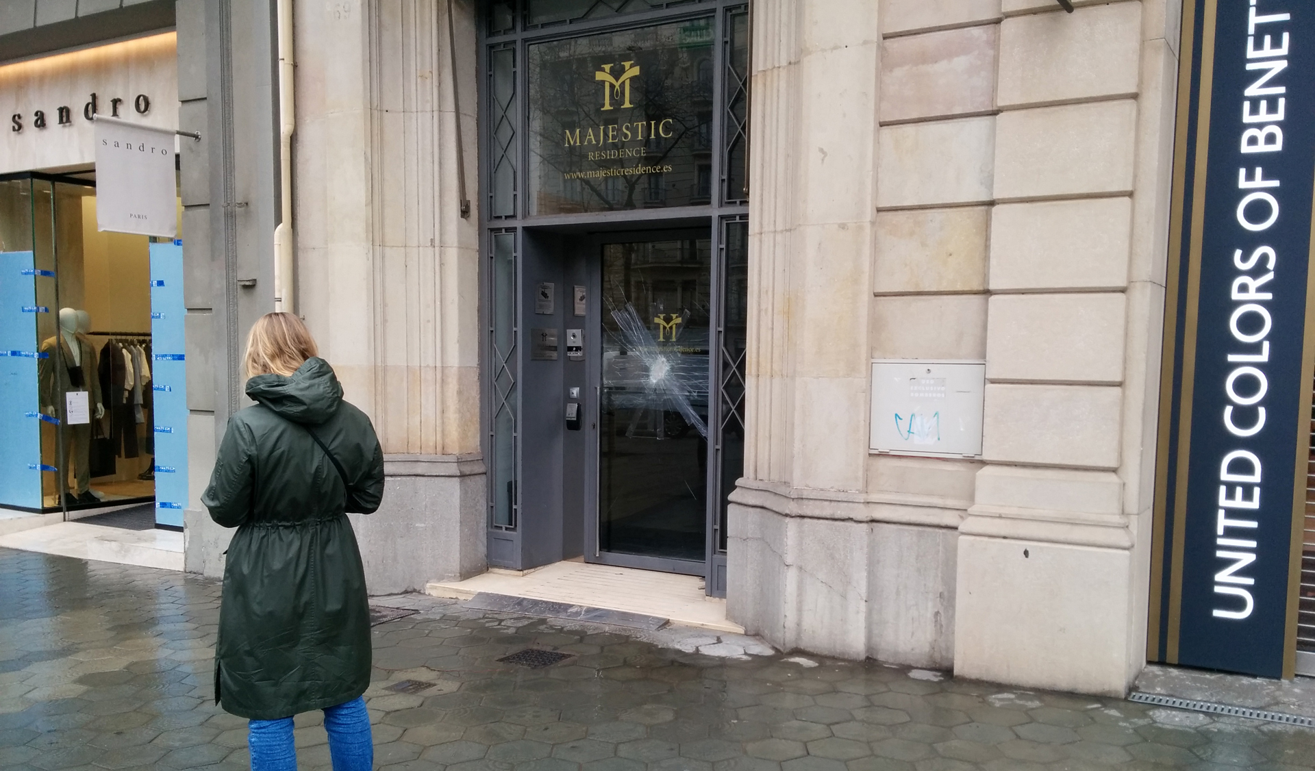 Una de las entradas al Hotel Majestic dañada a causa del lanzamiento de un objeto contundente.