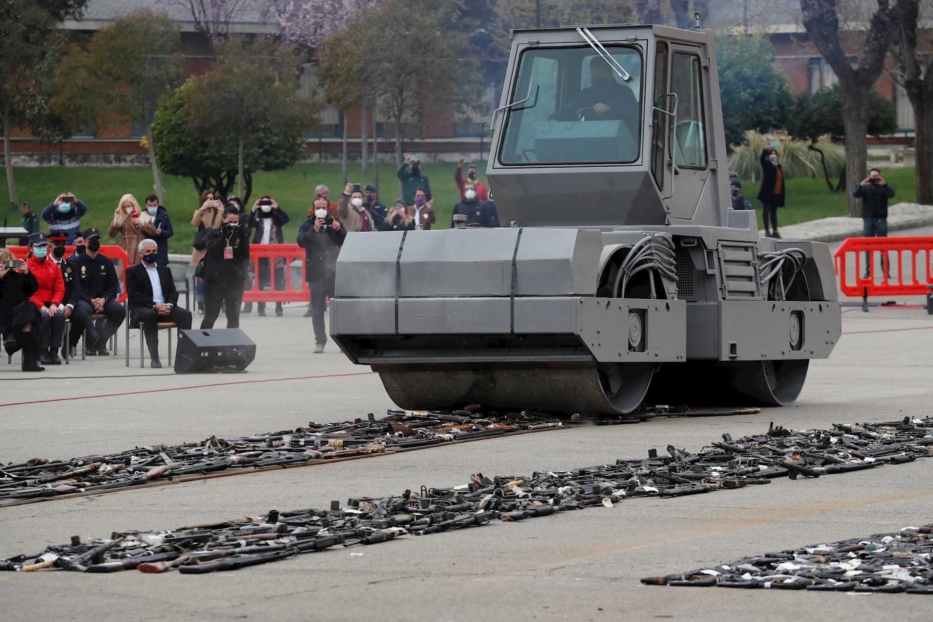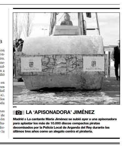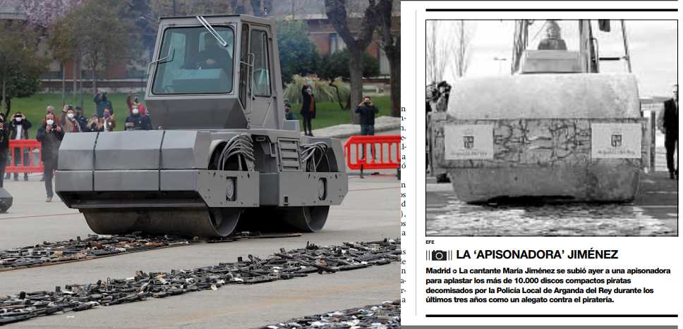 Iván Redondo, ideólogo de Moncloa al que se le atribuye cada acto de propaganda del Gobierno, parece que no tuvo una idea original con este gran acto propagandístico con tanqueta apisonadora incluida, ya que hay otros ejemplos cercanos. Uno muy sonado sucedió hace algo menos de 18 años cuando, en diciembre de 2003, la artista María Jiménez apareció en los medios con una apisonadora, destruyendo cientos de discos en plena calle. Su performance o representación pretendía ser una protesta contra la piratería. No sólo se montó a los mandos del gigante rodillo motorizado, sino que se bajó y zapateó sobre las copias.