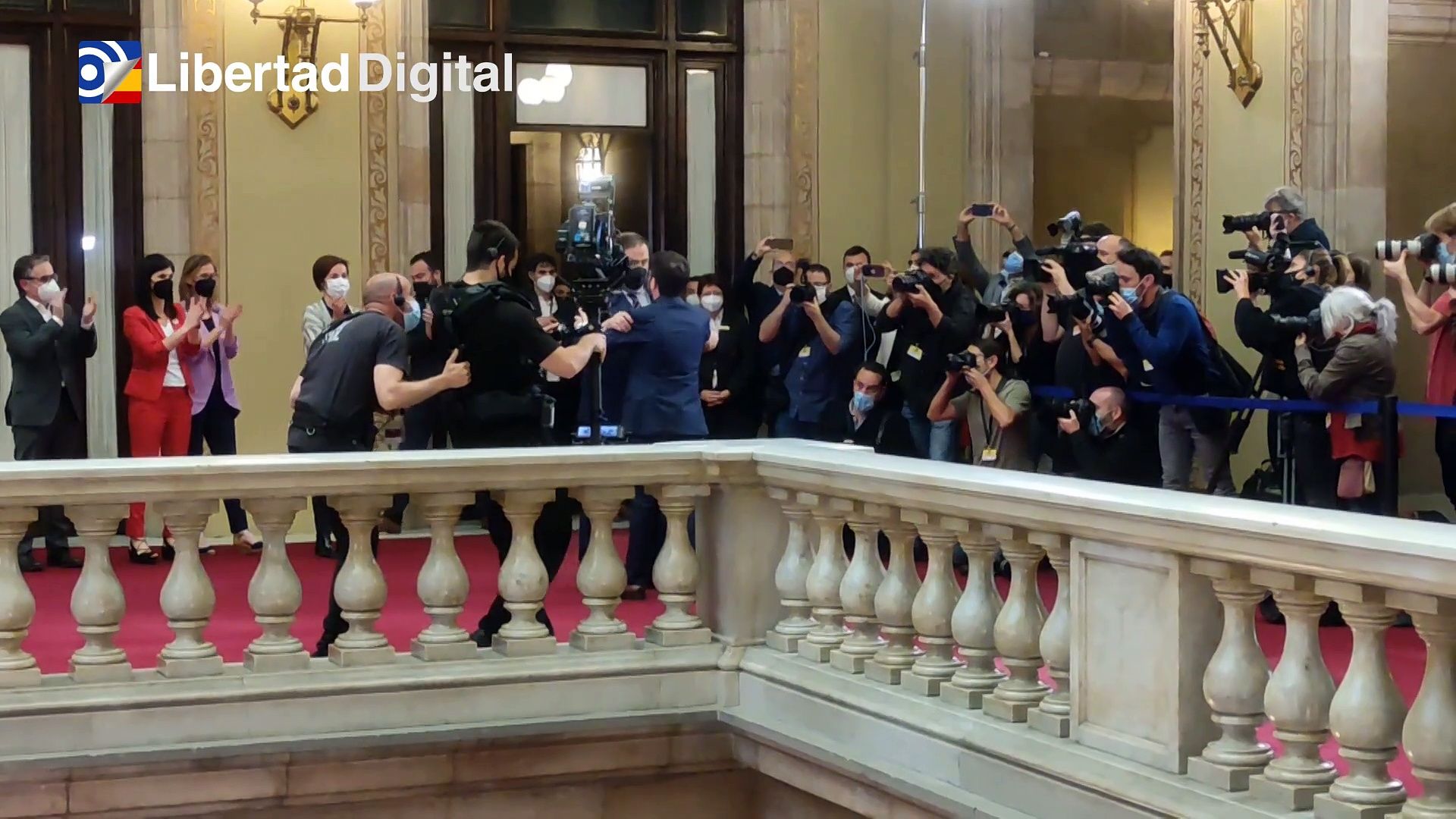 Imágenes del líder de ERC, Oriol Junqueras, que ha felicitado al número 2 del partido, Pere Aragonès, fuera del hemiciclo del Parlament tras ser investido presidente de la Generalitat.