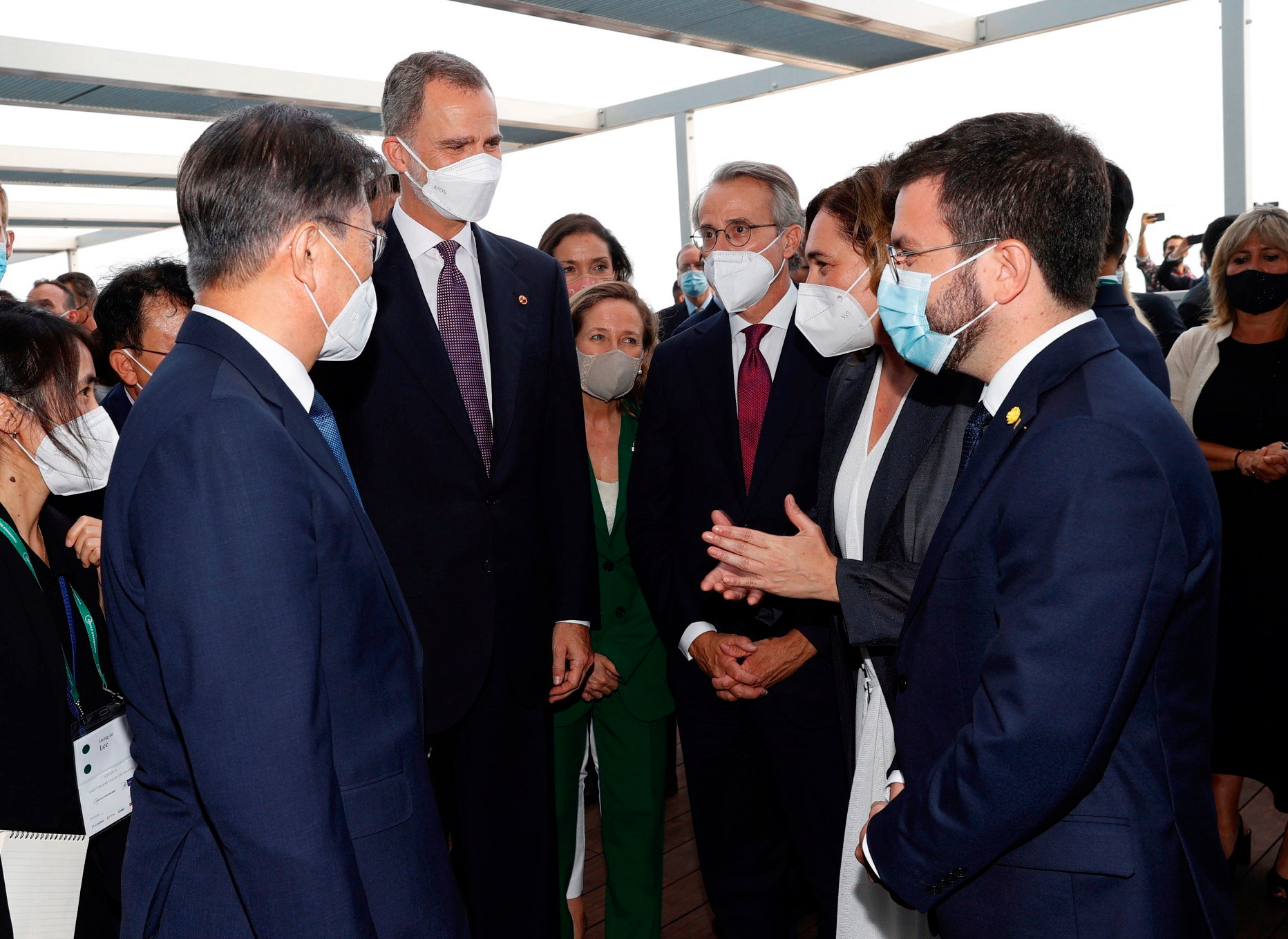 Testigos presenciales subrayan que el Rey y Aragonès han compartido una charla grupal en la que también estaban presentes las ministras Nadia Calviño y Reyes Maroto, la alcaldesa Colau y el presidente de Corea, Moon Jae-in. El multitudinario encuentro habría durado dos minutos y según algunos intérpretes de la actualidad catalana supone un notorio cambio de registro por parte de la Generalidad. Fuentes socialistas señalan que se pone fin así al boicot declarado por la Generalidad tras el mentado discurso del 3 de octubre. Es más, aseguran que Aragonès ha dado un vuelco a la política institucional de la Generalidad a pesar de que ha evitado la cena con Felipe VI, a la que ha enviado a su consejera de Presidencia, Laura Vilagrà. Lo que no ha evitado es una foto con el Rey, el presidente de Corea, Colau, Calviño y Faus.