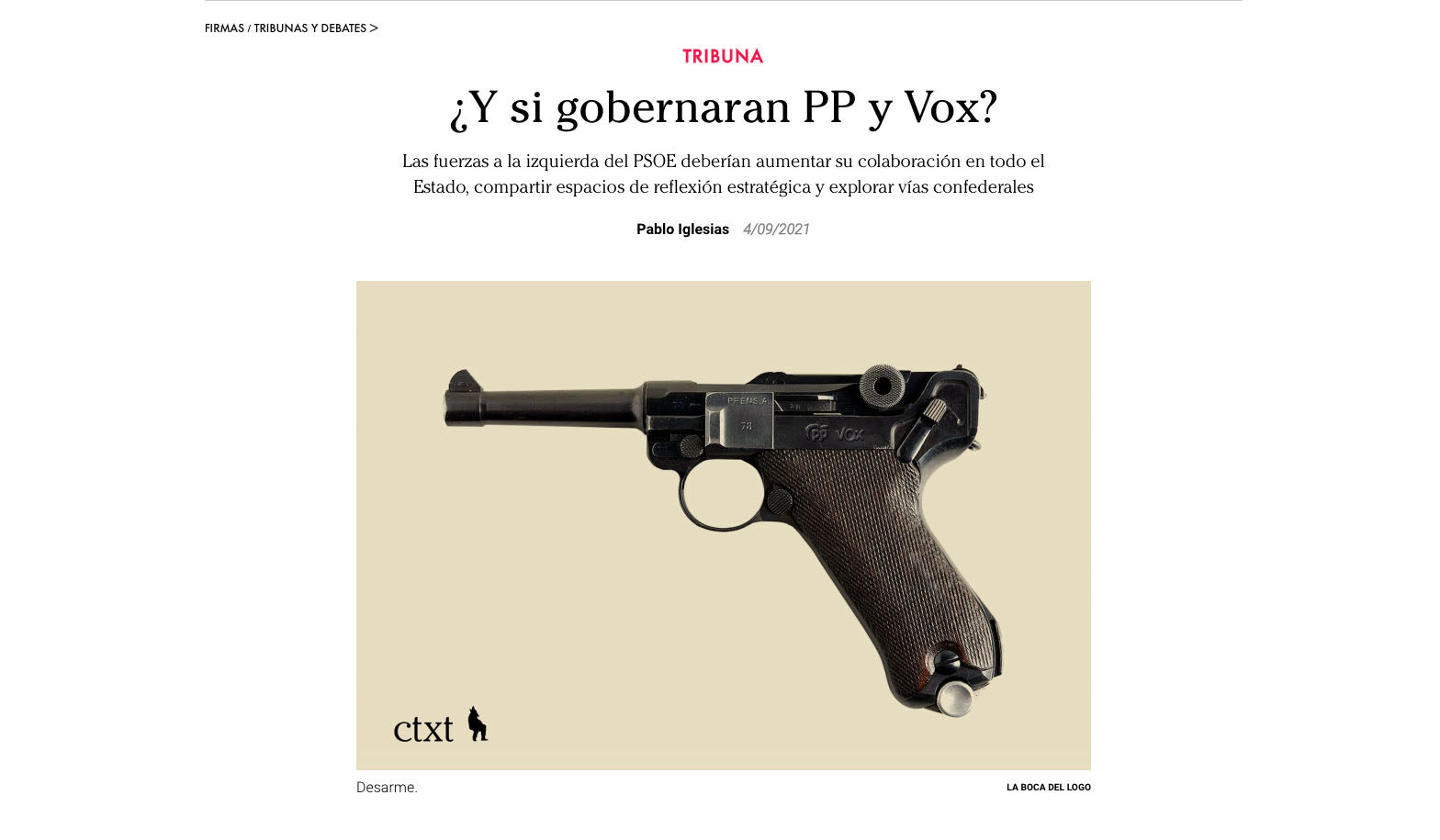 La nueva estrella mediática de la izquierda, el exvicepresidente Pablo Iglesias, publica este fin de semana su primera columna en el medio de ultraizquierda Ctxt, en la que reflexiona, por decirlo de alguna manera, sobre las consecuencias que podría tener la llegada al poder de una gobierno de coalición de PP y Vox.