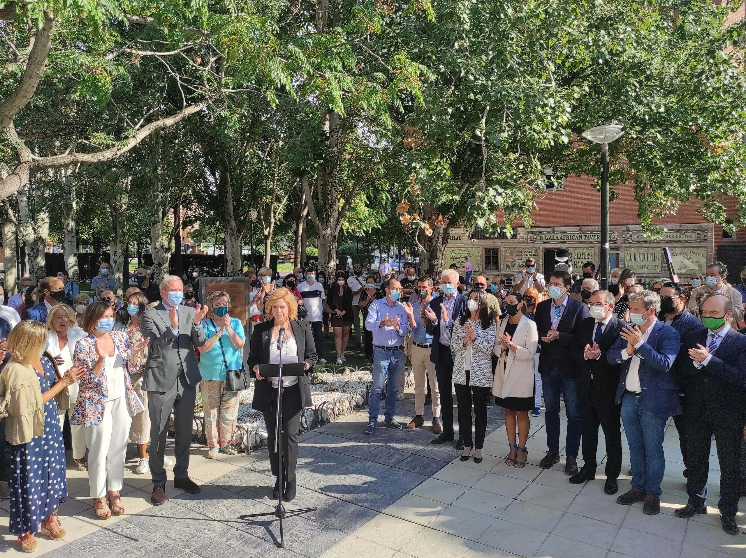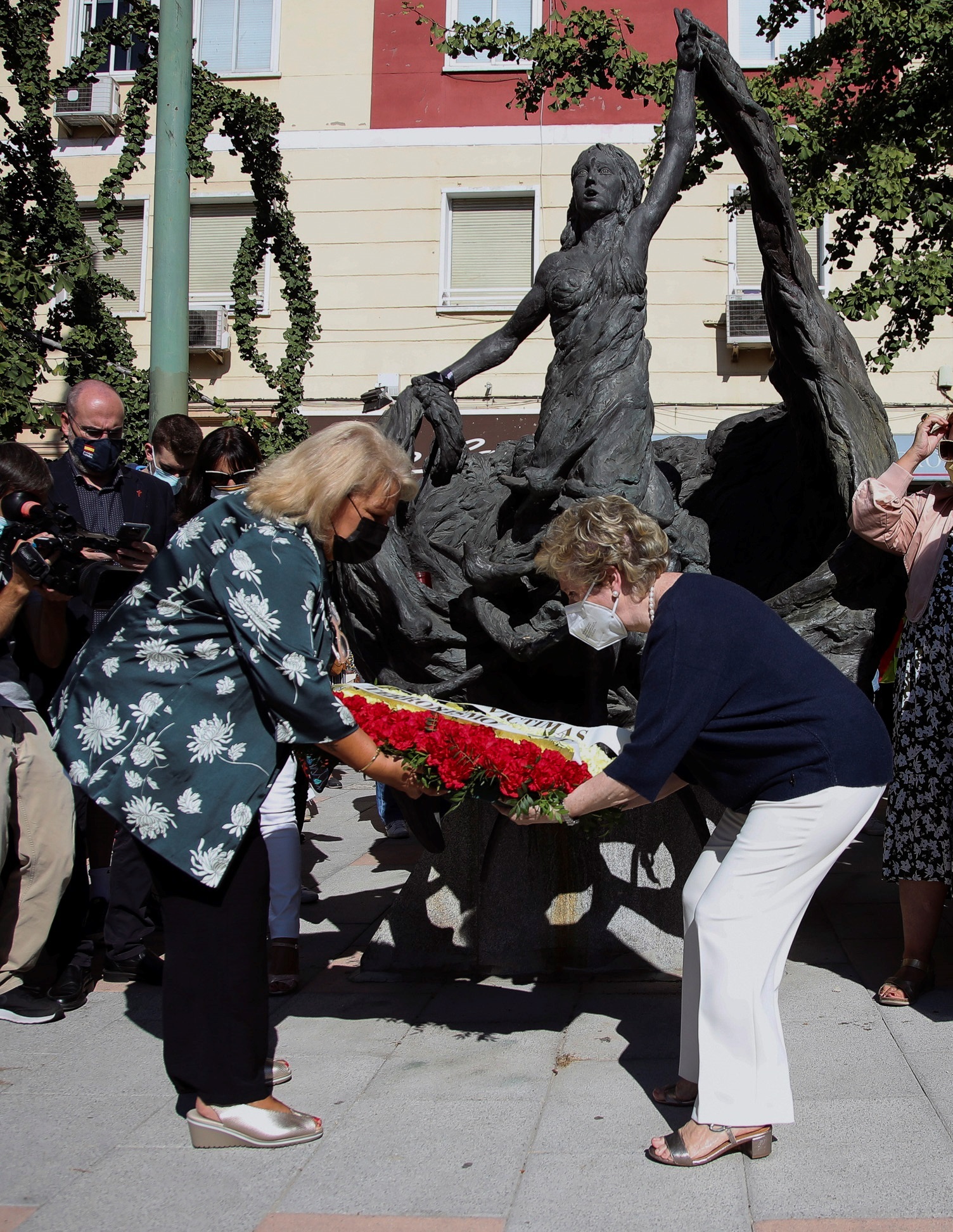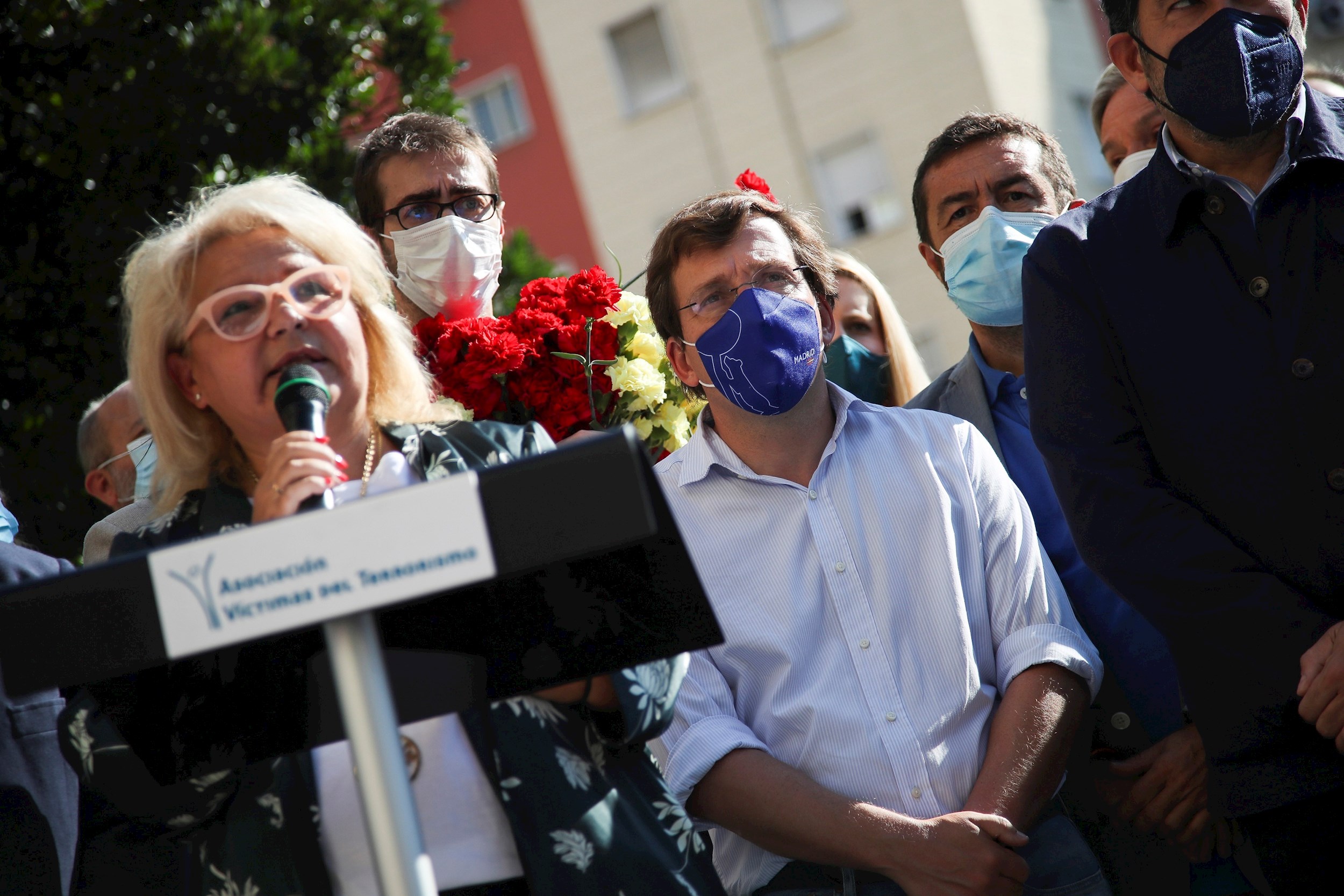 La presidenta de honor de la AVT, Ángeles Pedraza, ha participado en la ofrenda floral que la asociación ha organizado en la Plaza de la República Dominicana de Madrid, una de las muchas que había convocado en toda España.