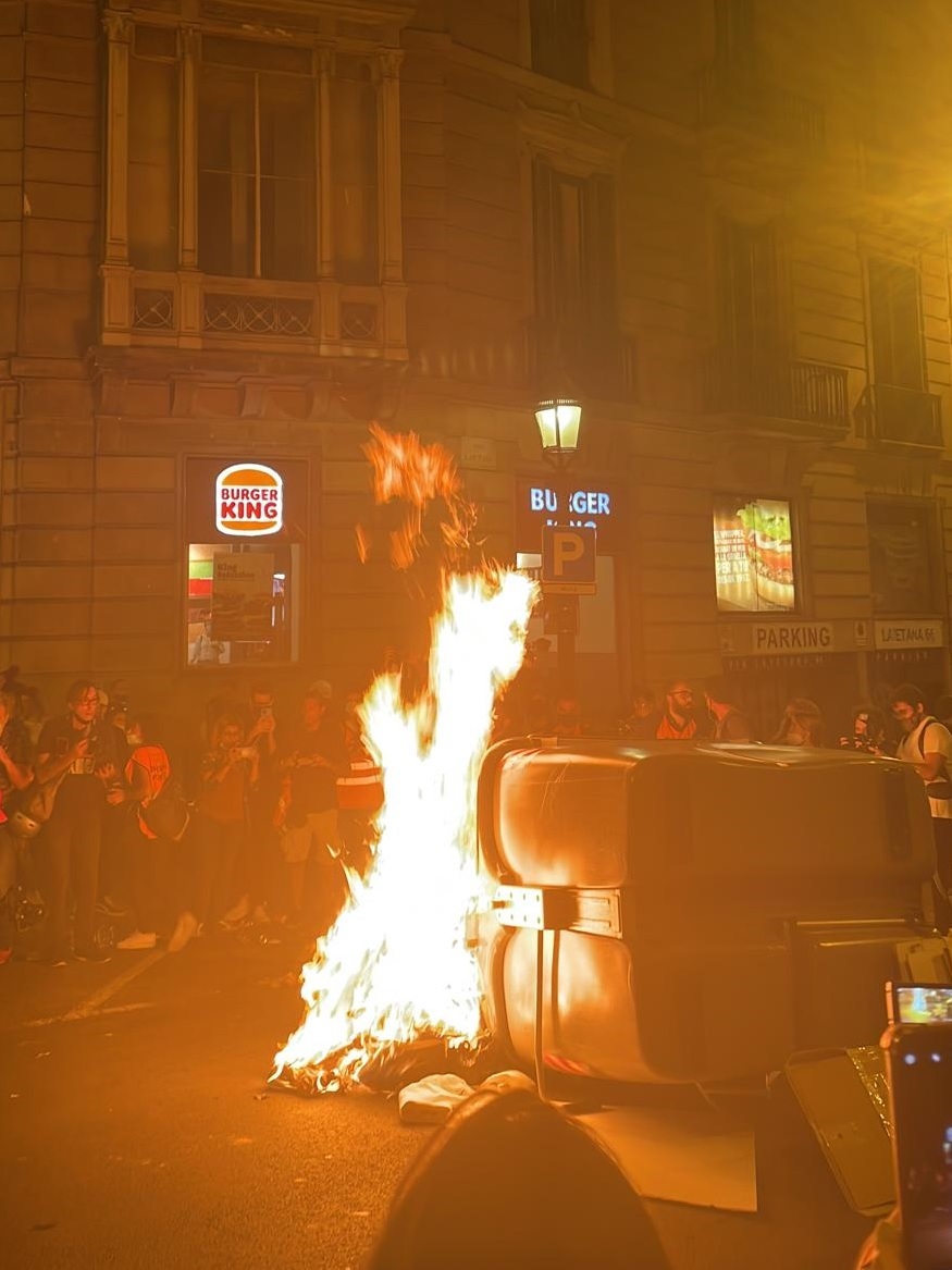 Horas después y en Barcelona, los CDR jugaban al gato y al ratón con los Mossos d'Esquadra. Los agentes trataban de dispersar a los manifestantes violentos sin emplear la fuerza. Nuevos episodios de violencia. Contenedores en llamas, calles cortadas, lanzamiento de objetos y carreras. Era el fin de fiesta del cuarto aniversario del 1-O, otra noche de disturbios en el centro de la ciudad sin que los partidos independentistas condenaran los actos vandálicos de los CDR.