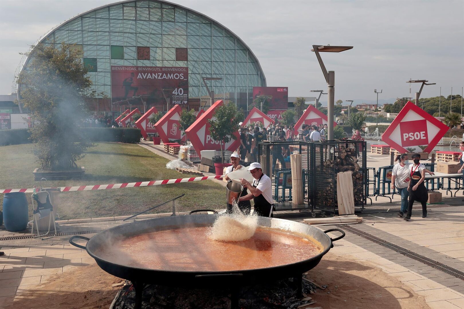 El espectáculo sólo acababa de comenzar. A los pocos minutos, el himno del PSOE empieza a sonar a todo volumen. A los lados de la Feria de Valencia, al compás de la música, empiezan a lanzar fuegos artificiales. Del cielo cae un globo blanco del que cuelga una acróbata que va dando vueltas en el aire como si fuese un espectáculo del Circo del Sol. "Así somos los socialistas", dice un militante mientras se quema la pólvora. "Tenemos un himno precioso", dice otra observando la danza en el aire de la mujer de blanco.