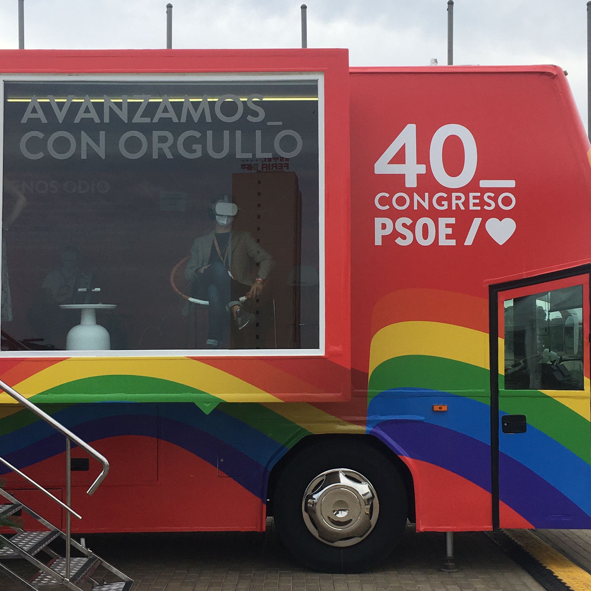 El Congreso del PSOE tiene un poco de todo. Además de hologramas hay un autobús donde, gracias a unas gafas futuristas, se puede vivir una experiencia en realidad aumentada, por si tuviesen poco con los discursos triunfalistas. El escenario principal, lleno de pantallas leds, en un enorme hangar parece un concierto de rock o un festival como Eurovisión. Detrás del graderío, en los vomitorios, se pueden visitar varios stands. Desde la Fundación Carme Chacón para "operar a los niños y niñas de todo el mundo con cardiopatías congénitas" a recargar el móvil o plantar un árbol para reducir CO2 en el espacio "Txiki Benegas". También pintarse un mural con manos de colores arcoíris en la Fundación Pedro Zerolo.