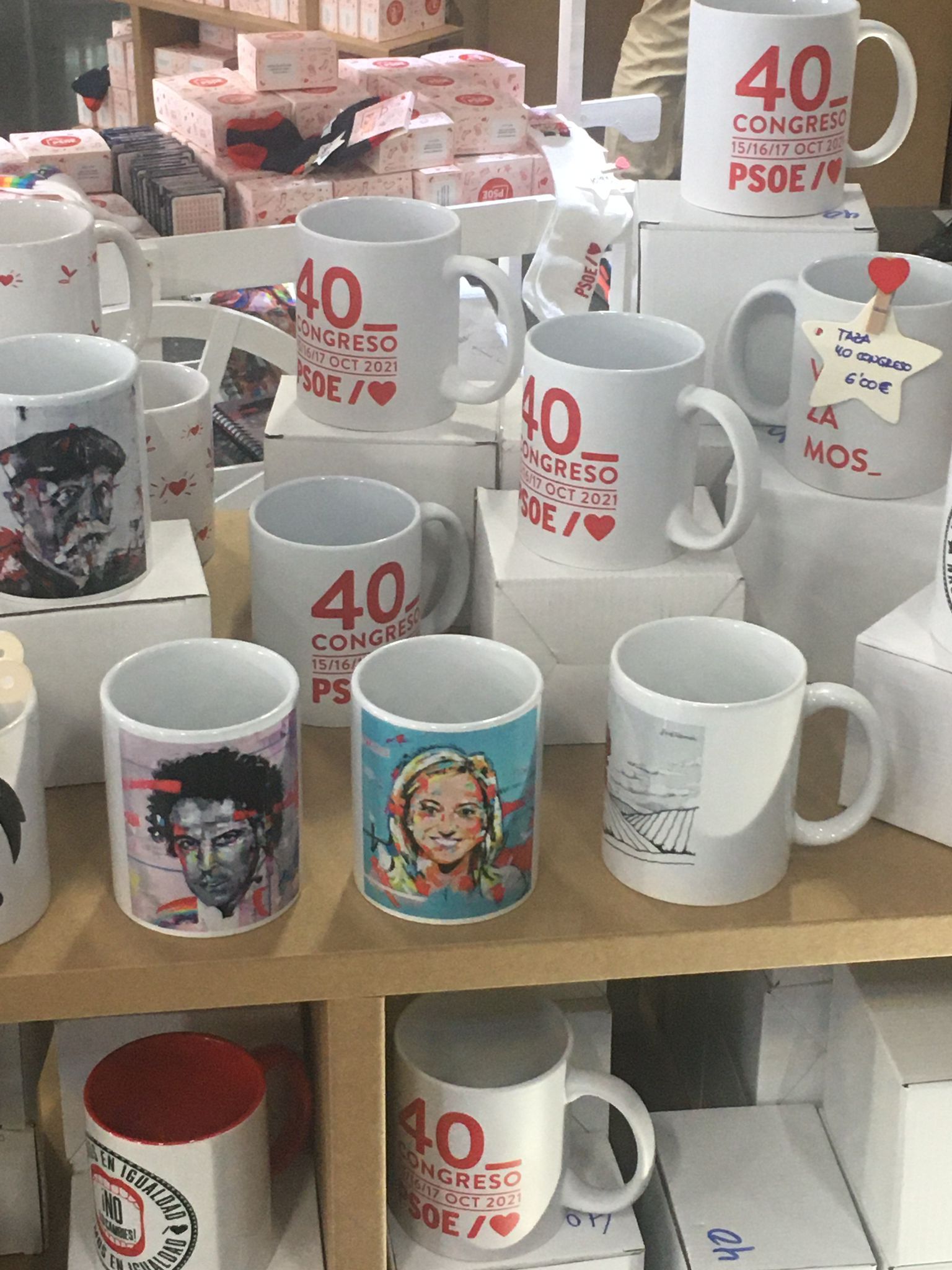 Los más fanáticos no se conforman con la bolsa PSOE que le dan a los delegados a su llegada, tampoco con los bolígrafos oficiales. Quieren más. Para ellos, en la planta baja, hay un espacio denominado "Tienda PSOE" dedicada a vender el merchandising del partido. ¿Lo más demandado? "Las tazas del 40º congreso y también la de Zerolo", nos cuenta la vendedora. Sí, hay tazas con dibujos pop-art como si Pedro Zerolo, Carme Chacón, Carmen Alborch y Pablo Iglesias (Posse, no Turrión) hubiesen posado ante Andy Warhol. "La gente se queja de que los pines son muy caros", le lamenta la misma vendedora. Un pin cuesta 8,50 euros.