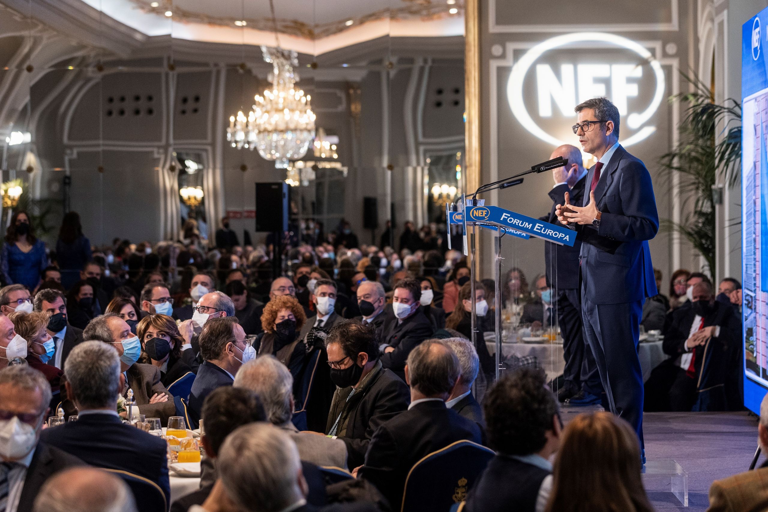 Que Bolaños es el hombre fuerte del Ejecutivo no lo duda nadie. La prueba más palmaria es la concentración de ministros, hasta cinco incluyendo a la ministra de Derechos Sociales y líder de Podemos, Ione Belarra, secretarios generales de sindicatos, como Unai Sordo, o empresarios reunidos para escuchar el desayuno informativo del ministro de Presidencia en el Nueva Economía Forum del Hotel Ritz Mandarín. Un salón repleto que recordaba a tiempos pre-pandémicos.