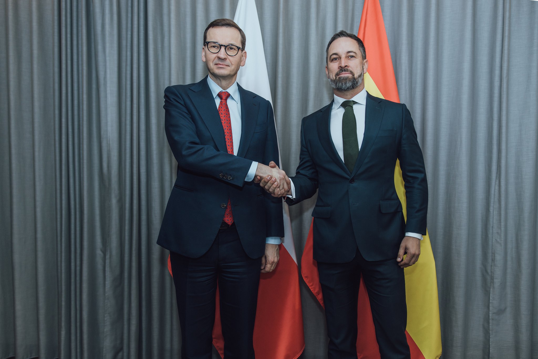 El líder de Vox ha preferido salir acompañado por el polaco Morawiecki para mostrarle su "apoyo por los ataques que está recibiendo en la frontera" y "de las instituciones de Bruselas", coincidiendo con la crítica que ha lanzado a Putin en una entrevista en El Mundo, en la que ha señalado que "el sueño imperial de Putin será una pesadilla para la UE".