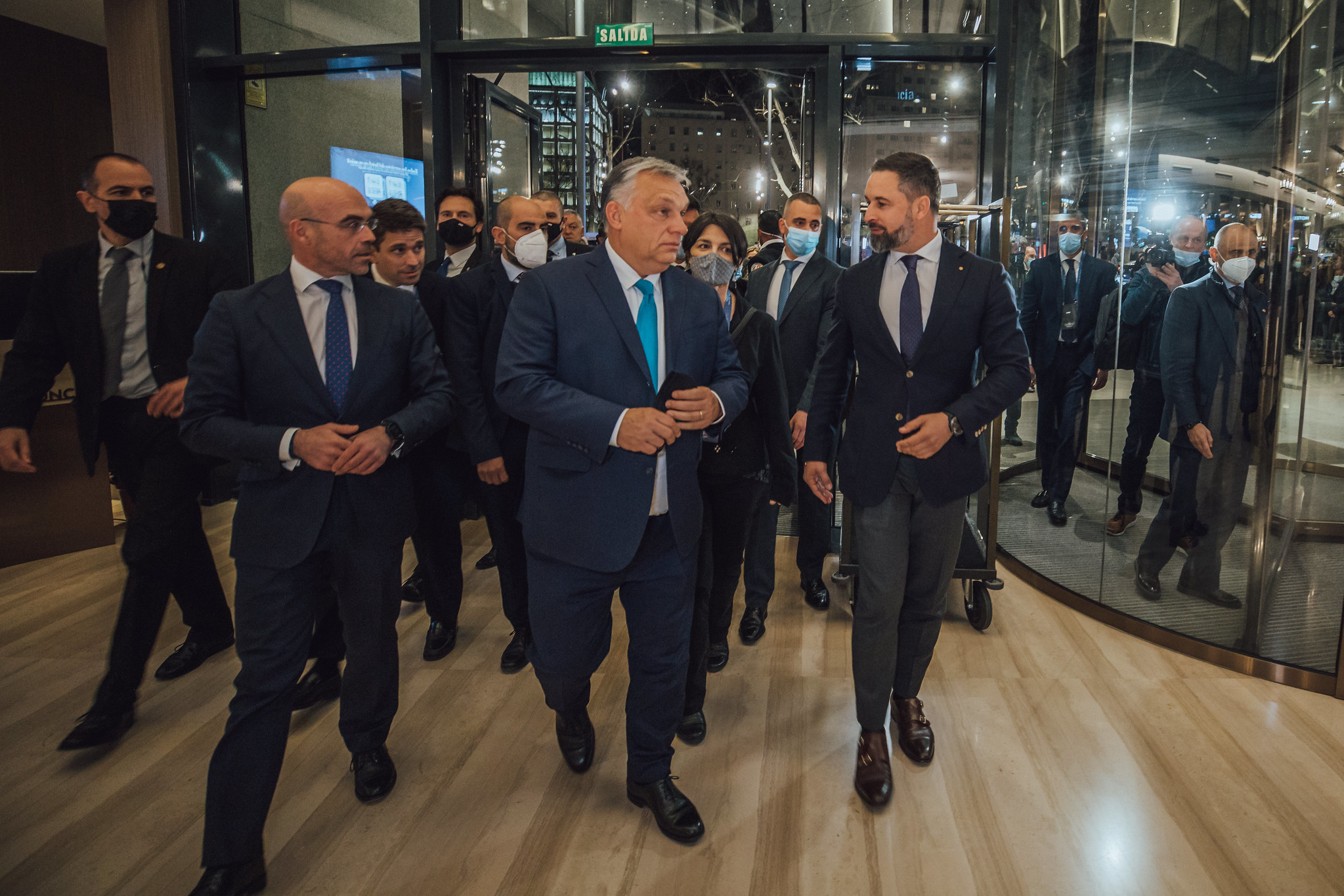 El líder de Vox se ha cuidado de no comparecer frente a los medios junto a Orban, que se ha dirigido en solitario a la prensa a las puertas del Hotel VP Plaza de España Desing donde ha tenido lugar el encuentro. El primer ministro húngaro ha evitado criticar al ruso Vladimir Putin a pesar de la insistencia de la prensa, a unos días de reunirse con él en plena crisis con Ucrania. El partido sí distribuyó ayer un vídeo del recibimiento que Abascal le dio a su llegada a la Cumbre.