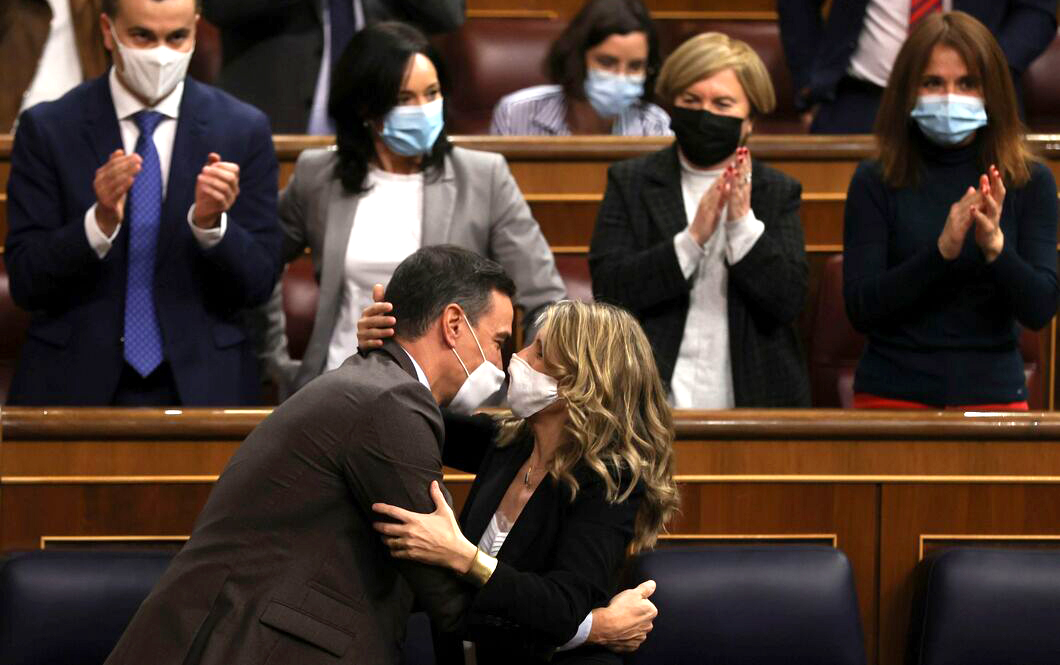 Sánchez y Yolanda Díaz se abrazan en el Congreso después de sacar adelante la reforma laboral.