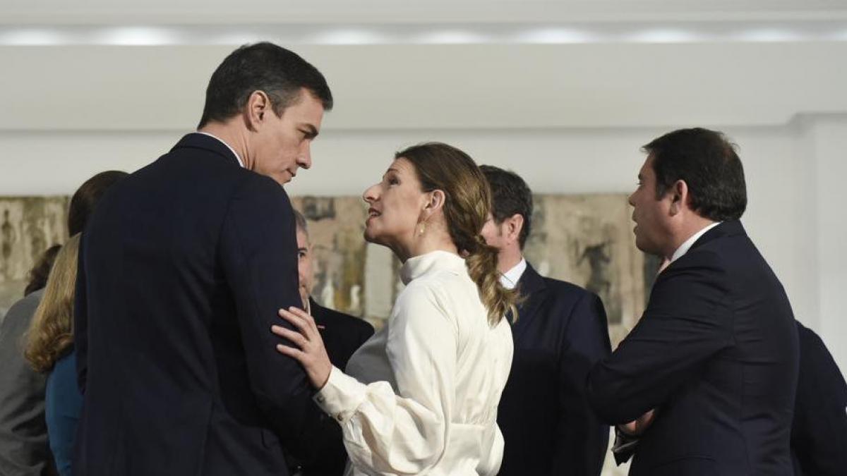 Gestos amistosos y con cierto cariño entre Yolanda Díaz y Pedro Sánchez durante la cumbre Hispano-Portugesa celebrada en 2021.