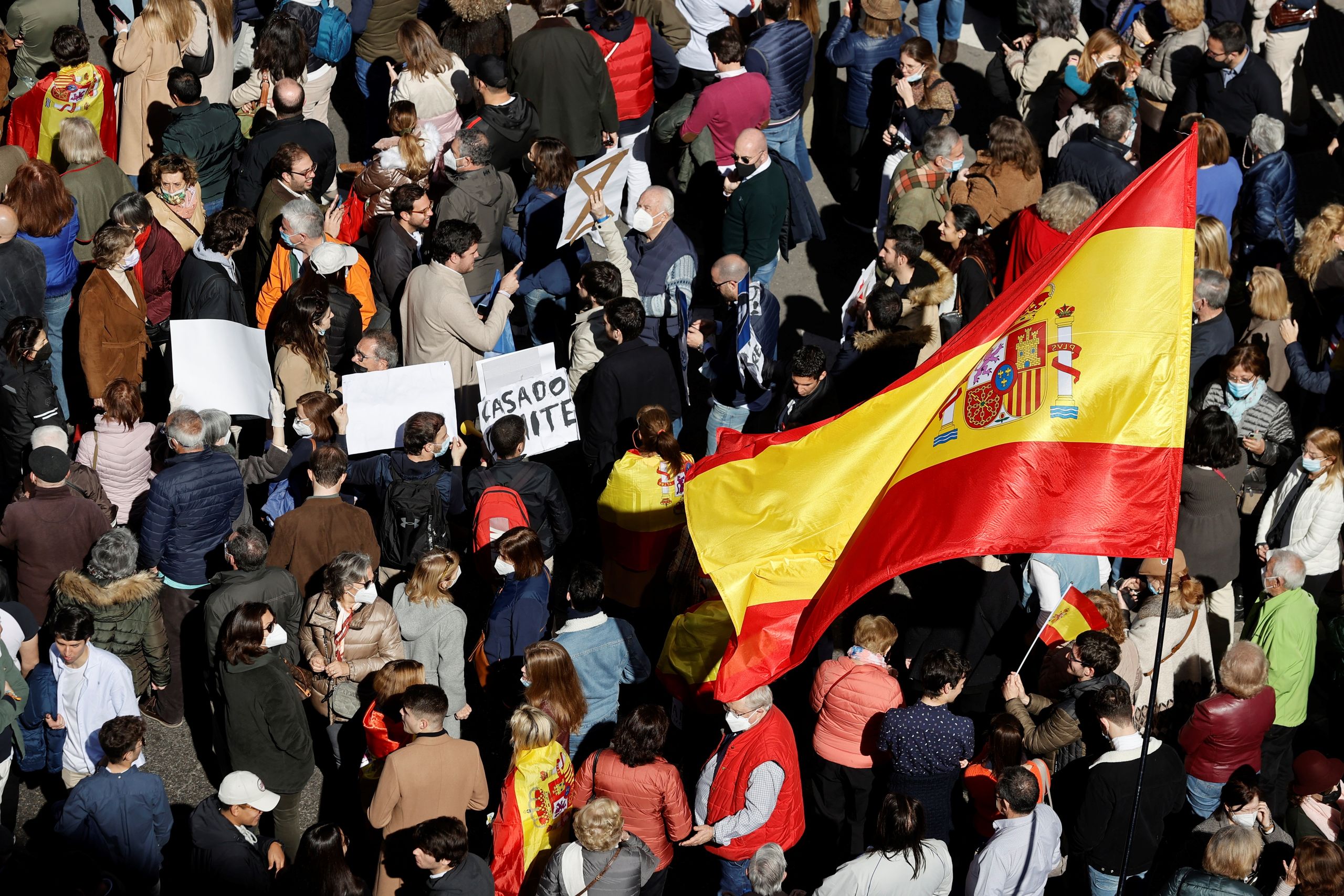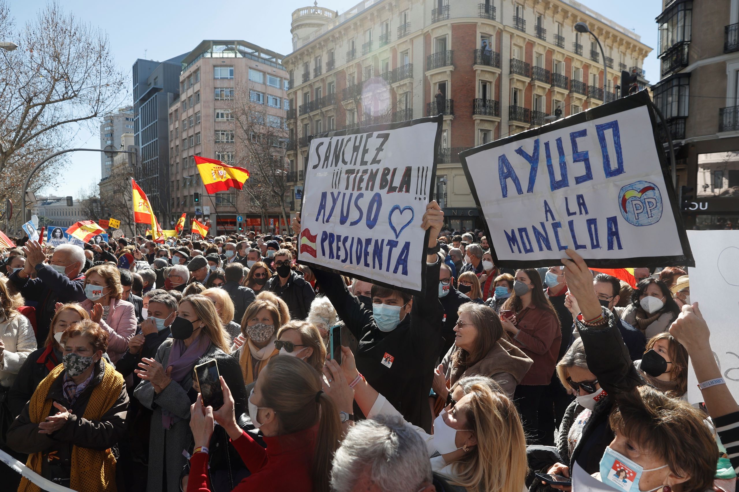 “Sánchez, tiembla. Ayuso presidenta" ha sido uno de los lemas coreaos durante la concentración.