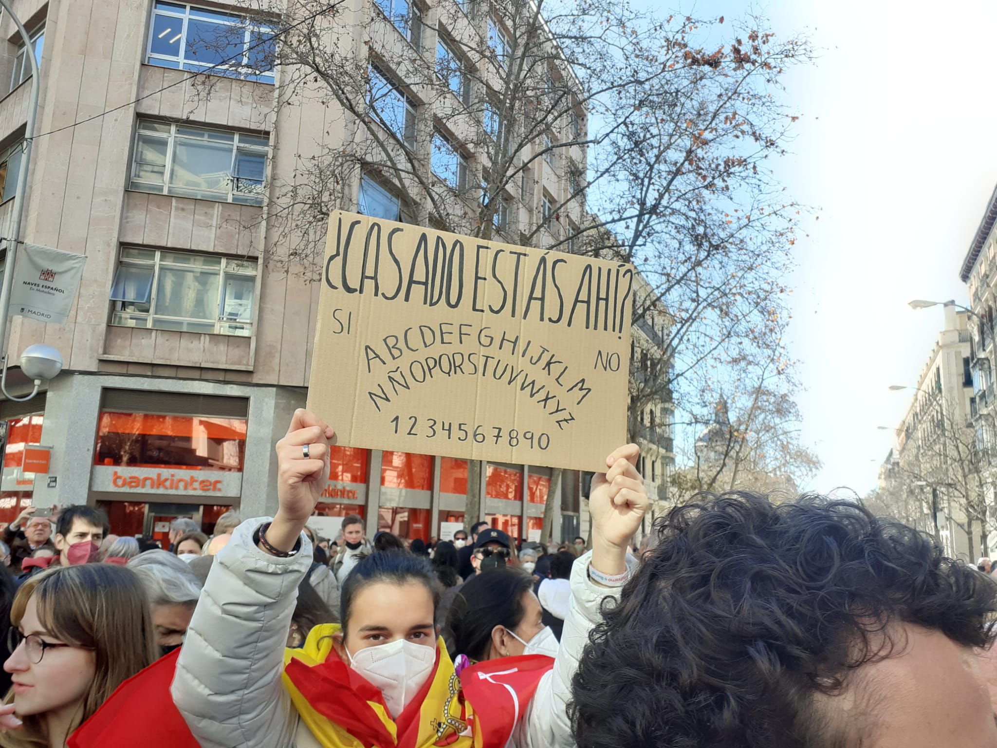 Con un tablero de ouija improvisado, esta manifestante se pregunta dónde está el líder de los populares.