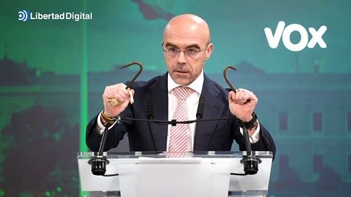 Durante la rueda de prensa ofrecida en la sede nacional de Vox en la calle Bambú, Buxadé ha exhibido dos ganchos de hierro que fueron utilizados para atacar a la Policía Nacional y la Guardia Civil en la frontera española, llegando a golpear con ellos el atril desde el que hablaba para denunciar que los medios y la izquierda han pretendido "criminalizar" a los agentes por su actuación contra los inmigrantes, en lugar de señalar que fueron los agredidos.