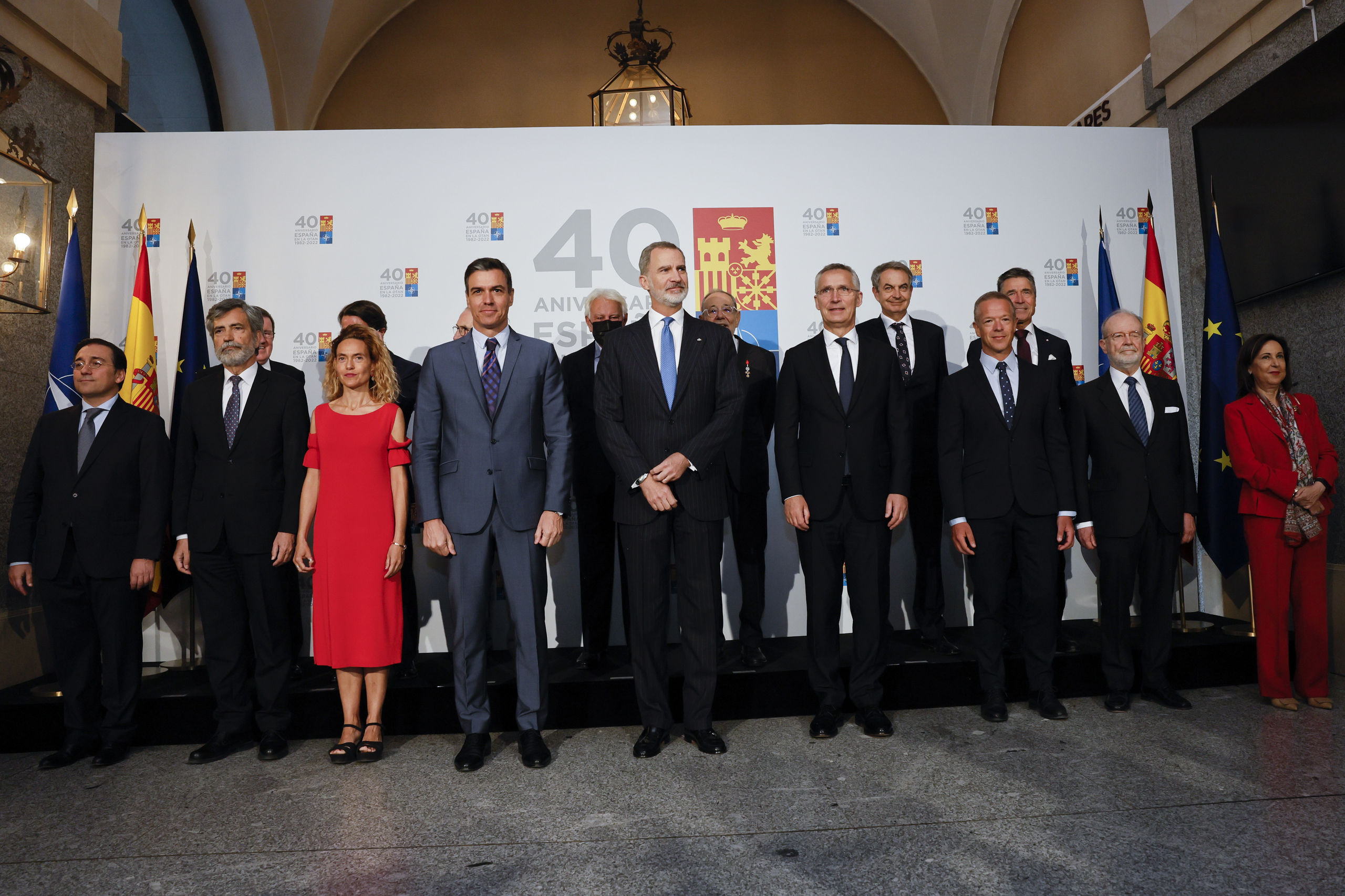 Hasta siete ministros, todos del PSOE, y ninguno de Unidas Podemos, han asistido a la celebración solemne del 40 aniversario del ingreso de España en la OTAN. Un acto en el Teatro Real con 300 invitados, que ha estado presidido por el Rey Felipe, con la presencia del secretario general de la OTAN, Jens Stoltenberg, tras una reunión en La Moncloa para preparar la cumbre de la Organización Atlántica en Madrid a finales de junio.