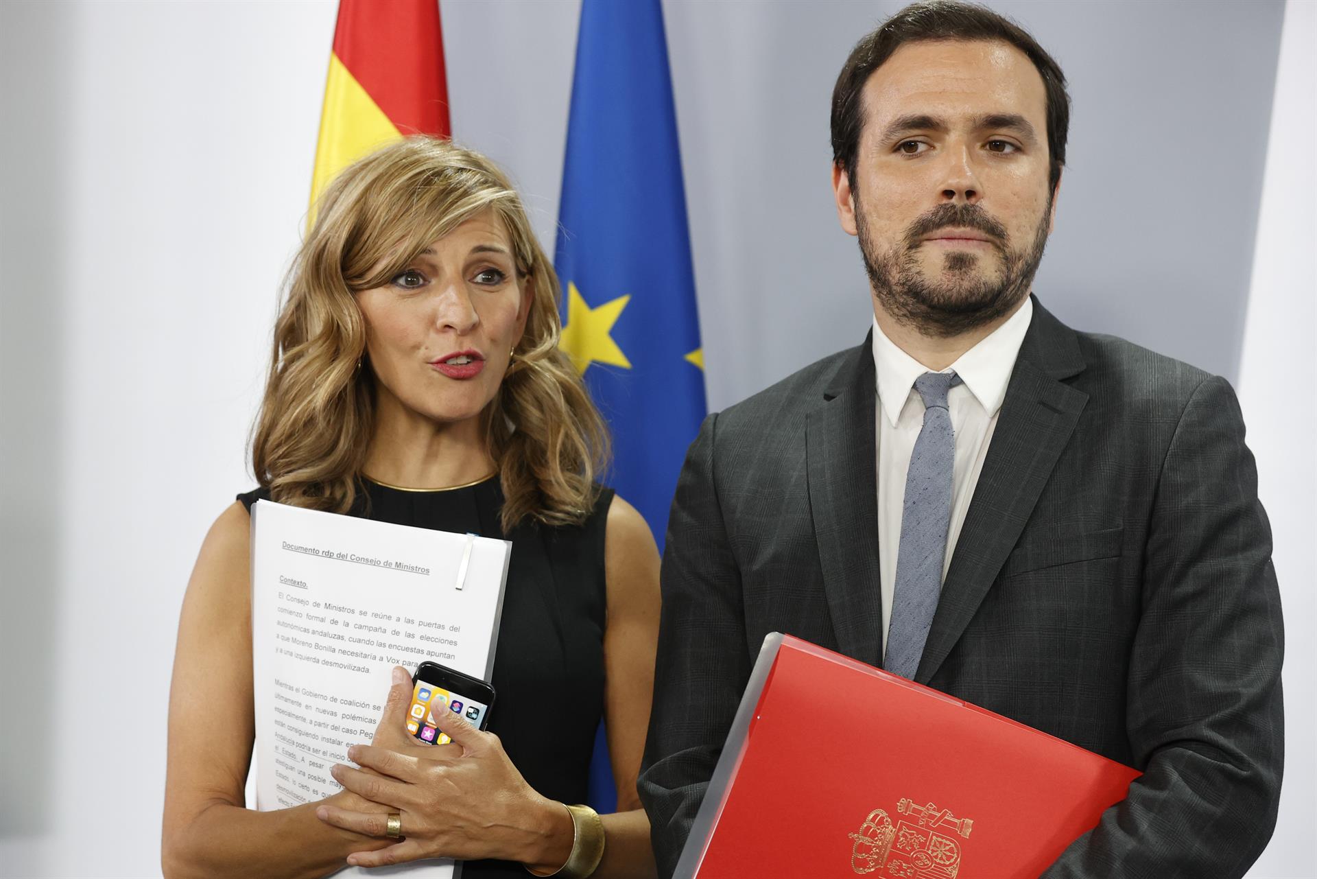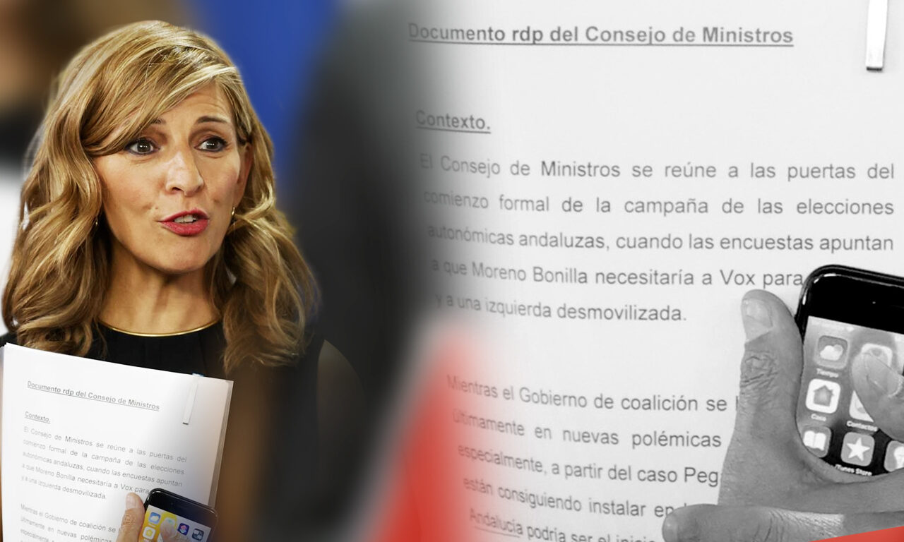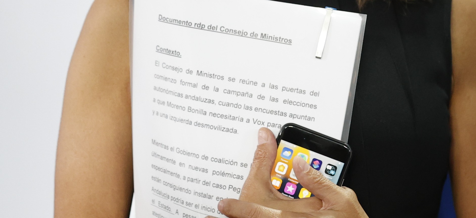 Tal y como se ha podido ver en el papel "Rueda de Prensa del Consejo de Ministros", que se ha podido leer tras una carpeta transparente que portaba Yolanda Díaz, el Gobierno asume que estamos "a las puertas del comienzo formal de las elecciones autonómicas andaluzas, cuando las encuestas apuntan a que Moreno Bonilla necesitaría a Vox en un contexto con la izquierda desmovilizada".