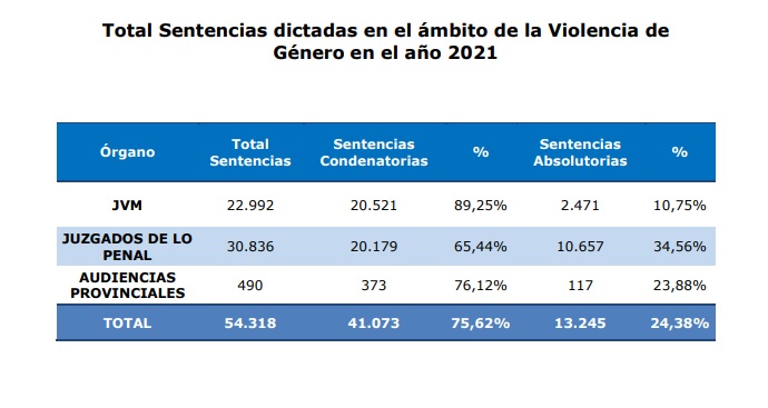 No obstante, el Informe anual sobre violencia de género también incluye en sus estadísticas la forma de terminación de todos los casos que llegan a juicio en el conjunto de los tribunales españoles (además de los especializados, los juzgados de lo penal y las audiencias provinciales). Según dicho balance, de los 54.318 casos que fueron enjuiciados en 2021, un 24,38% terminaron con la absolución del acusado, mientras que el 75,62% restante habrían concluido en condena.
