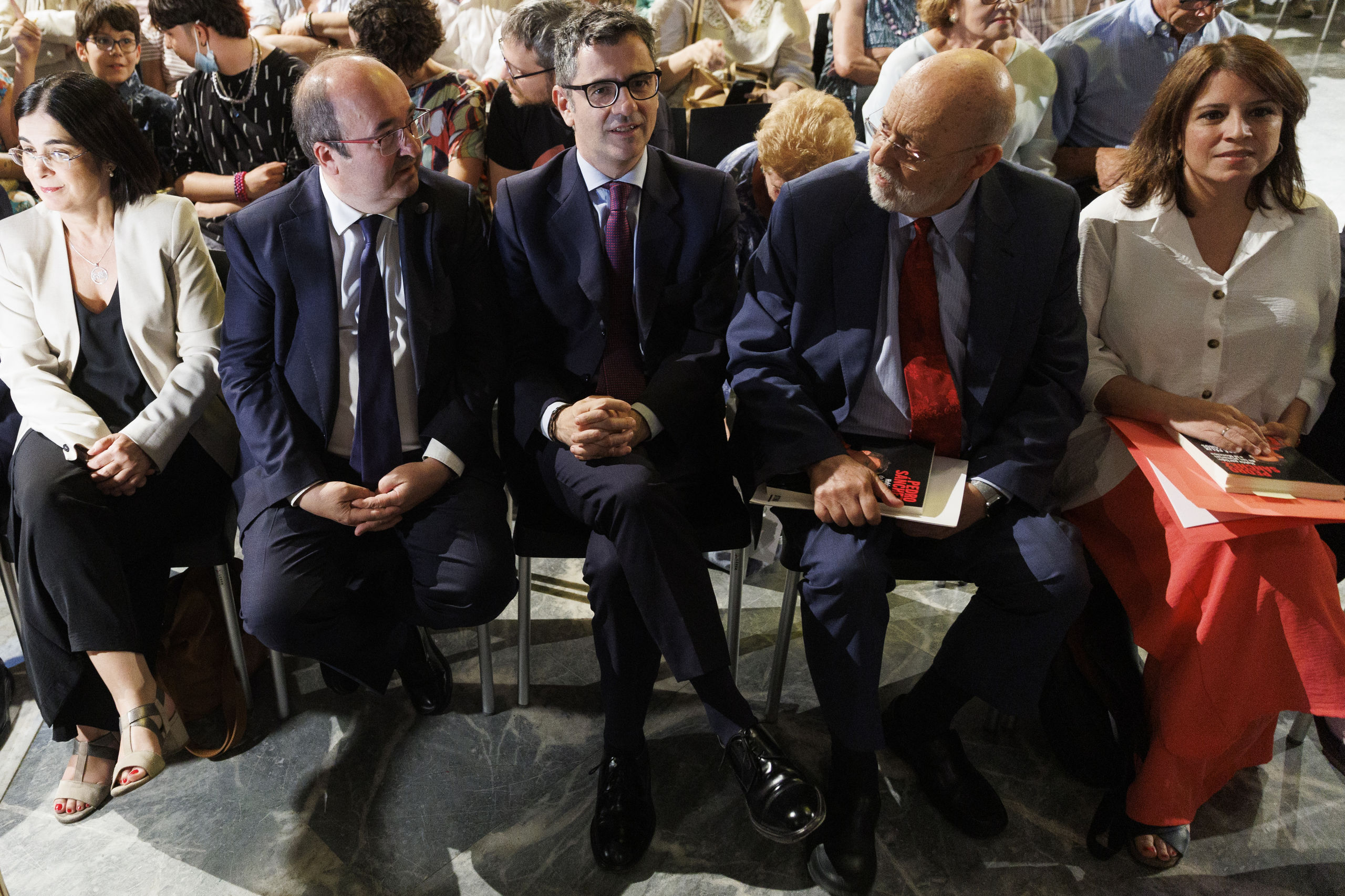 Todo ante un público muy socialista, que no ha dudado en aplaudir los elogios al presidente, y cuya media de edad evidenciaba que ya no estaban para entrar en Juventudes en los años de Isidoro, Felipe Gónzalez en la clandestinidad. En primera fila, estaban los ministros, Miquel Iceta, Carolina Darias y Félix Bolaños. Este último ha ejercido como telonero junto con la vicesecretaria general del PSOE. "Ideas, liderazgo y coraje político", ha afirmado la número dos del partido. Unos adjetivos que se han quedado cortos ante la retahíla de elogios del director del CIS. Una competición muy reñida por ver quién se convertía en el presidente del Club de Fans de Pedro.