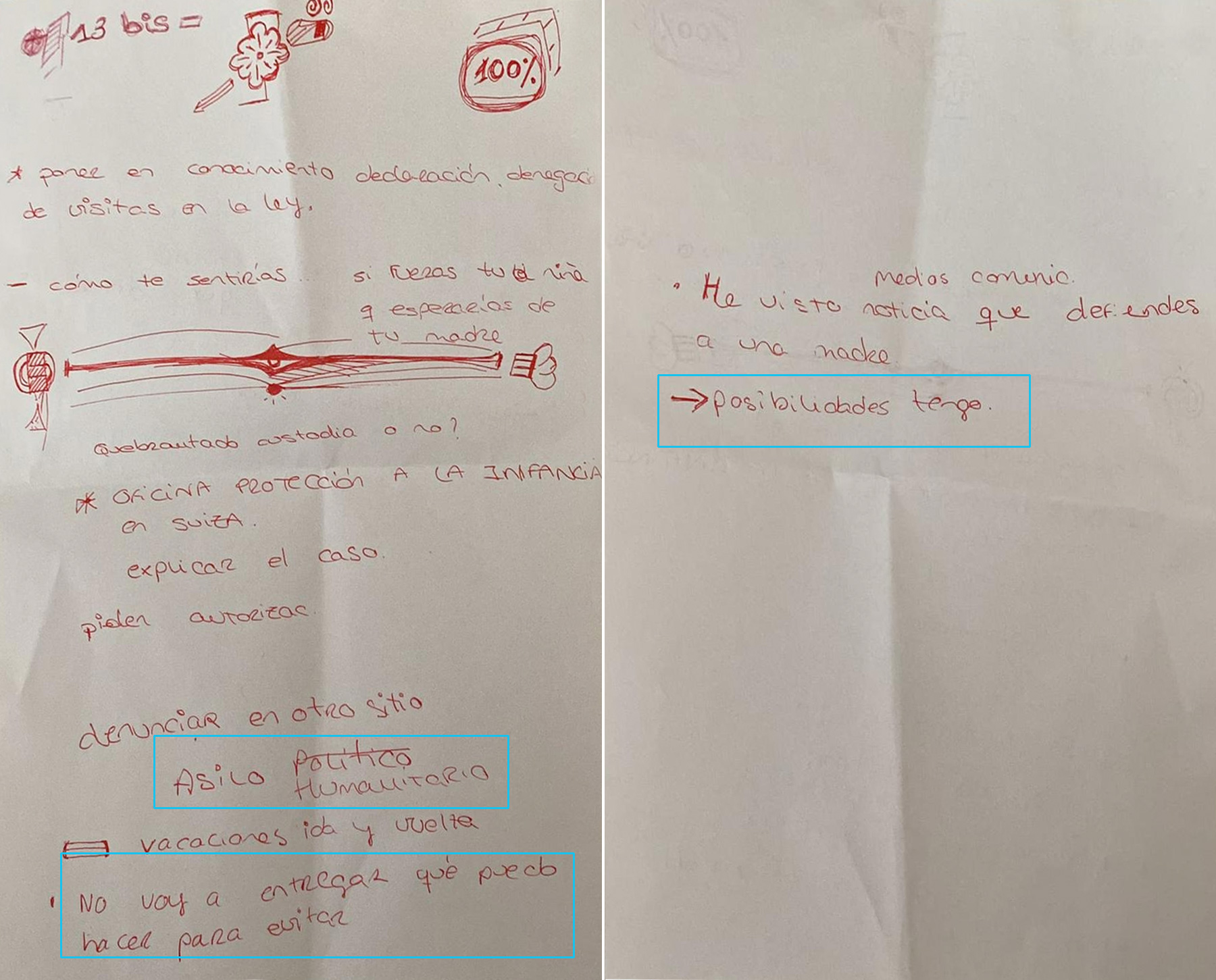 "No voy a entregar", se puede leer al final del primer folio que dejó escrito de su puño y letra, en unas anotaciones que recogen los pasos a seguir para consumar el secuestro. A pesar de que los investigadores desconocen si se trata de los consejos que alguien le pudo dar por teléfono o de sus propias reflexiones, lo cierto es que en ellas deja constancia del organismo al que pretende recurrir: "Oficina de protección a la infancia de Suiza". Y también de cuál es su objetivo: pedir "asilo humanitario". De hecho, en un primer momento, parece que Paola apuntó "asilo político", pero esta segunda palabra aparece tachada.