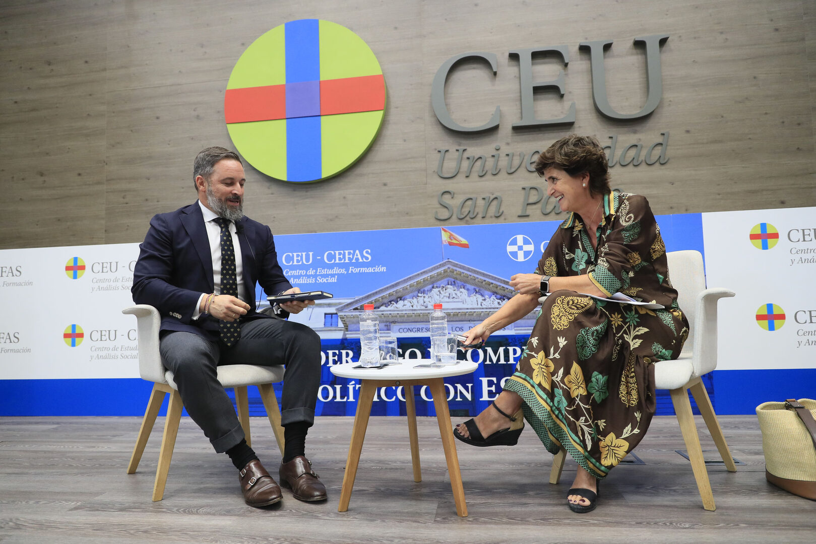 Santiago Abascal ha sido el protagonista de una conferencia sobre liderazgo político impartida en la Universidad CEU San Pablo, en la que ha compartido escenario junto la exdirigente del PP vasco, María San Gil. Durante su intervención ha lanzado varios mensajes a Pedro Sánchez y Alberto Núñez Feijóo en pleno intento de ambos por resucitar el bipartidismo.