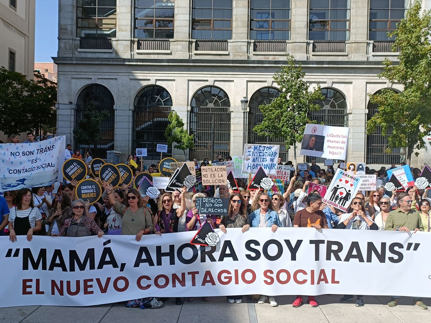 La concentración había sido convocada por Amanda, la Agrupación de Madres de Adolescentes y Niñas con Disforia Acelerada de la que ya forman parte más de 300 familias españolas víctimas de lo que han venido a bautizar como "el nuevo contagio social". Se definen como una agrupación "apartidista, independiente y laica", que aclara de antemano que "pedir prudencia no es transfobia".