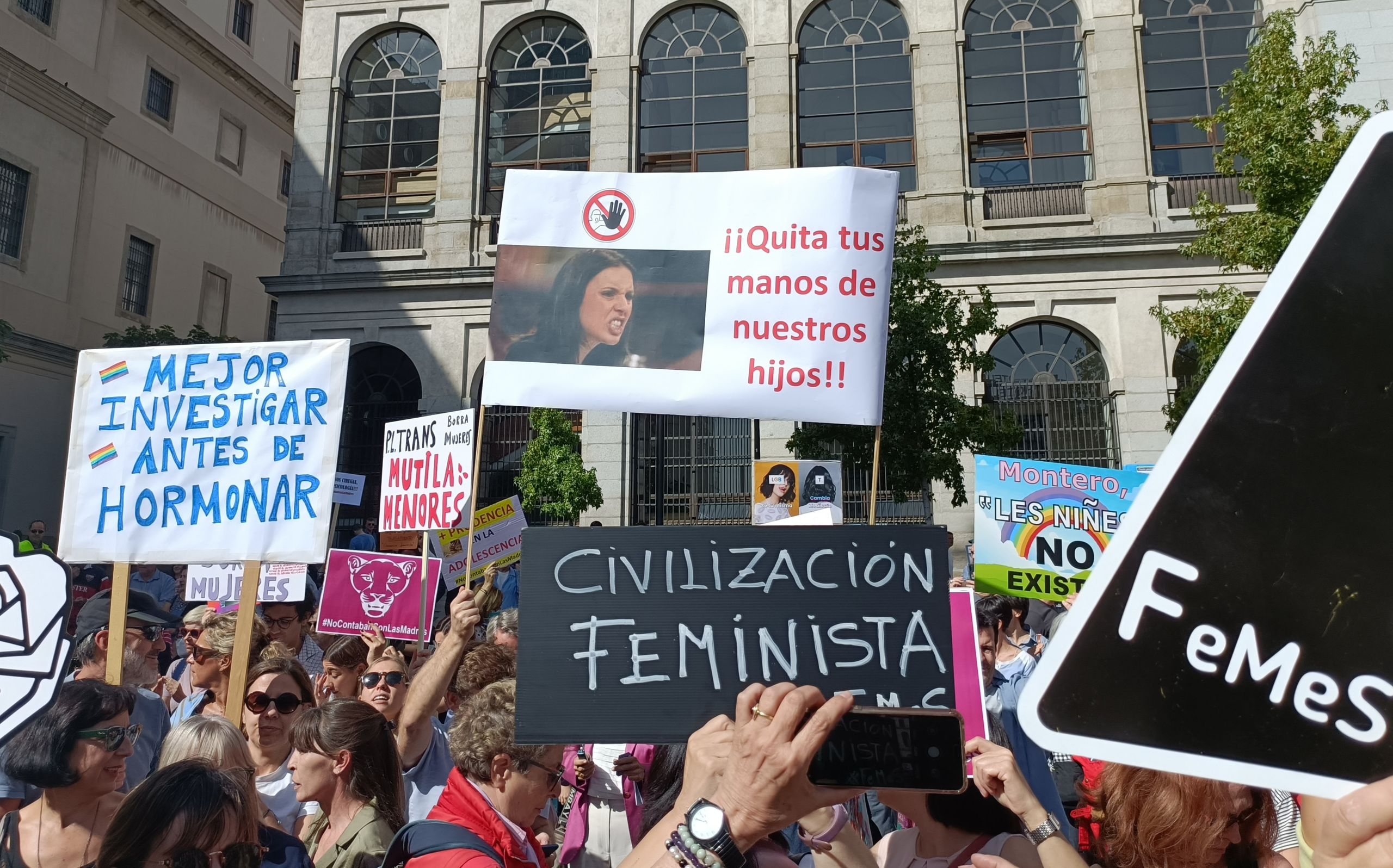 Hasta ahora, el colectivo que más ruido ha hecho contra la ley Trans de Irene Montero ha sido el de las feministas. Sin embargo, no son las únicas. "¡No contaban con las madres!", gritaban este sábado cientos de mujeres reunidas en la Plaza Reina Sofía de Madrid para protestar contra una normativa que "se va a aprobar de espaldas a la ciencia" y pedir la dimisión de la ministra de Igualdad. "¡Irene, transita, vete a tu casita!", coreaban las manifestantes.