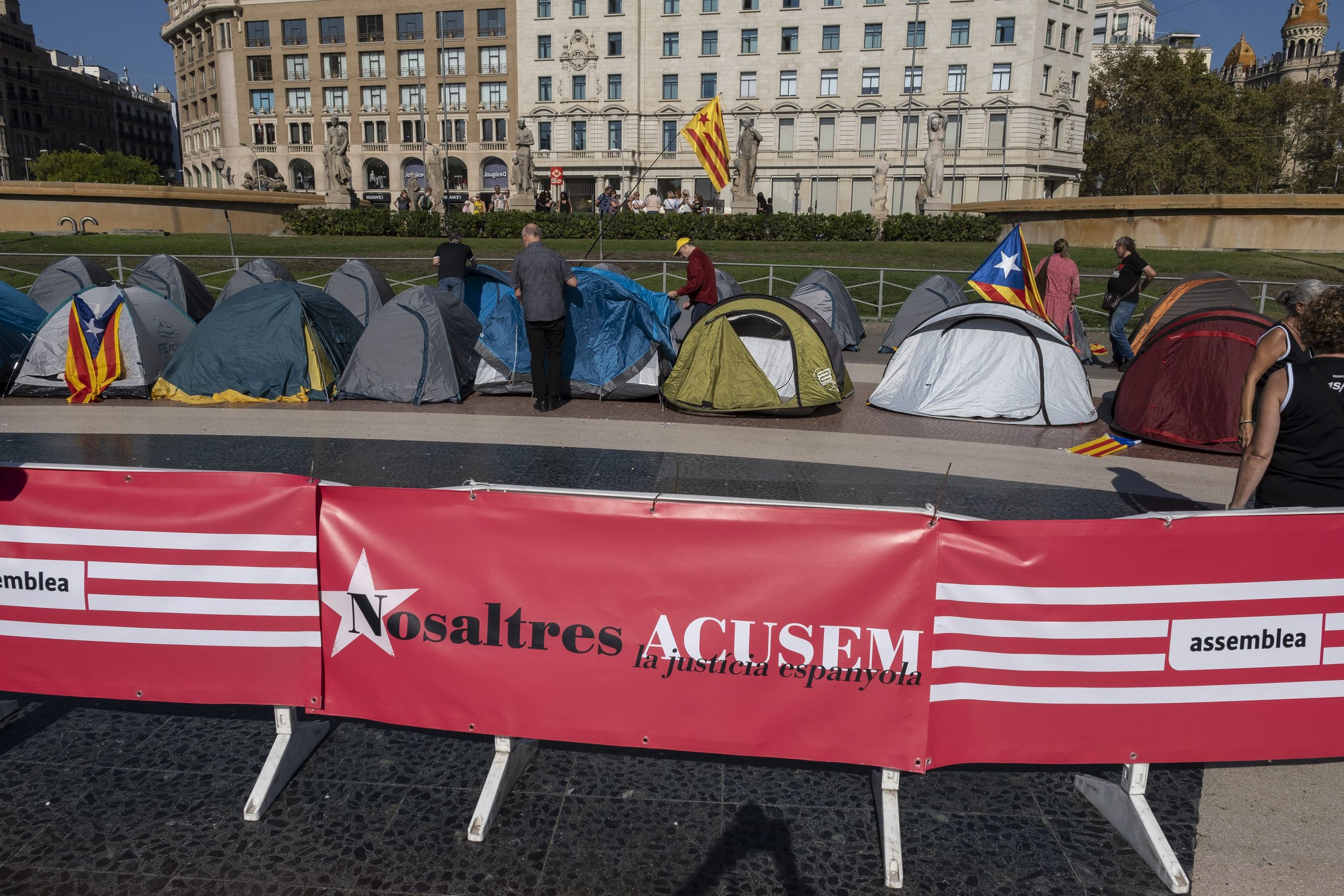 La ANC ha montado un escenario para los mítines y varias carpas donde intentan recabar nuevos socios. El cuadro se completa con una treintena de tiendas de campaña de dos plazas instaladas en un rincón de la plaza de Cataluña.