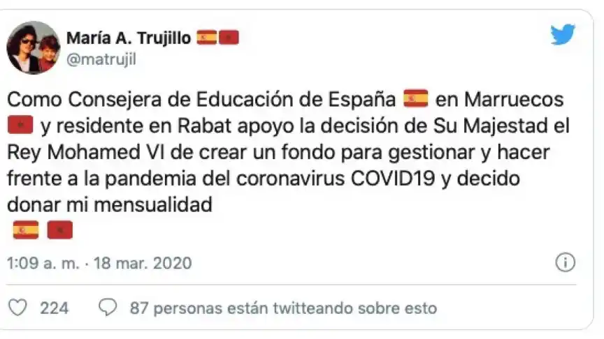 Desde entonces, Trujillo ha venido apoyando a Rabat en todas sus disputas, hasta el punto de que en el año 2020, acarició la posibilidad de convertirse en la embajadora de España en Marruecos, con el apoyo del propio ministro de Asuntos Exteriores, Nasser Bourita. Sin embargo, el polémico cese irregular de diez profesores interinos por teletrabajar desde el España durante el confinamiento frustró su nombramiento.