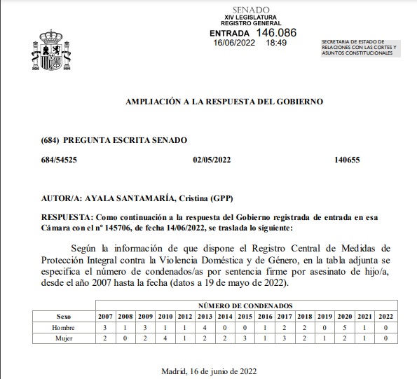 Indignada por el hecho de que a la hora de hablar de niños asesinados por uno de sus padres siempre se identificase al asesino con un hombre, Cristina Ayala Santamaría solicitó al Ejecutivo que desvelase el número de filicidios cometidos en los últimos 15 años y especificase cuántos habían sido perpetrados por hombres y cuántos por mujeres.