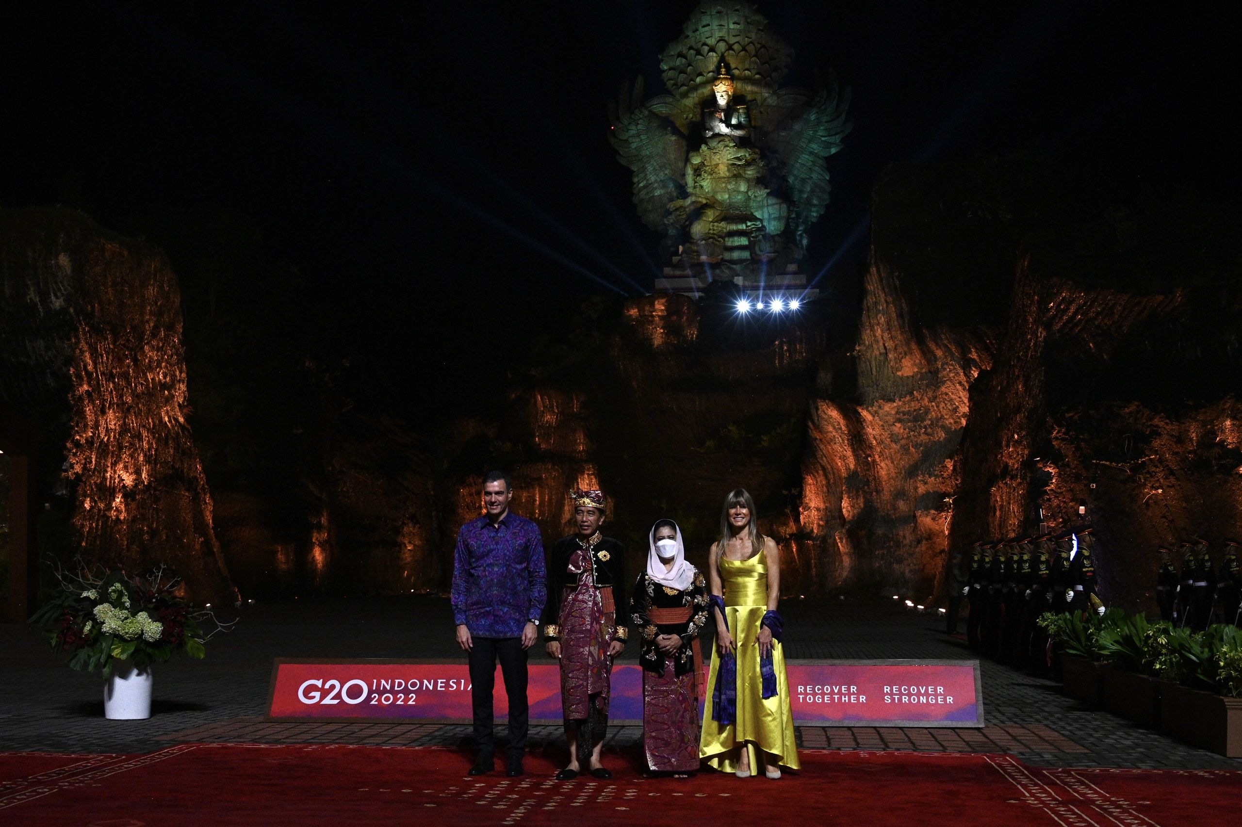 Todos los mandatarios del G20 se vistieron con las camisas tradicionales indonesias, pero pocos lo han hecho con una tela tan, digamos vistosa, como Pedro Sánchez. Por su parte, su mujer, Begoña Gómez, llevaba un vestido de un amarillo tan chillón que podemos decir que iba deslumbrante... en el sentido literal.